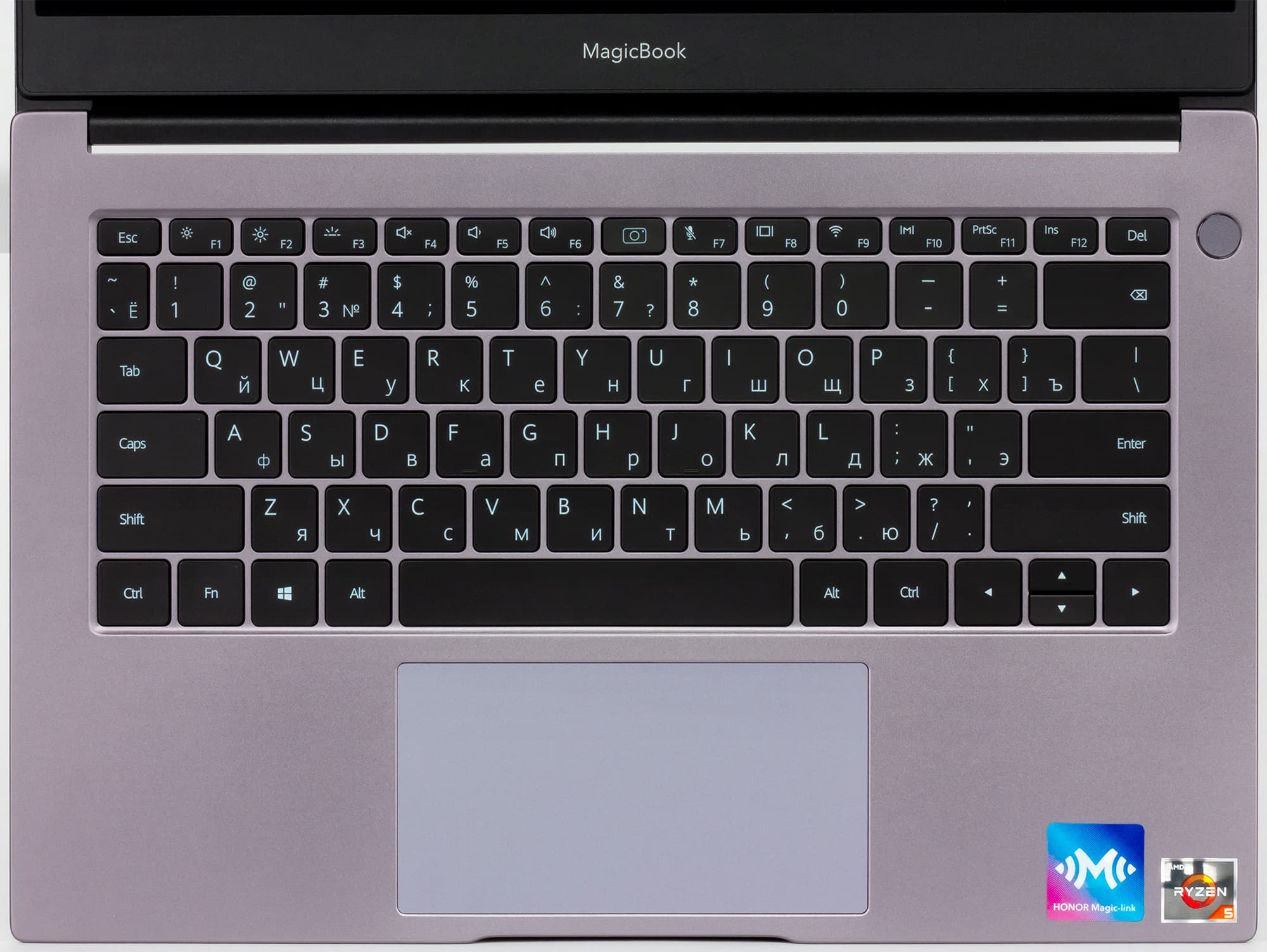 В арсенале Honor MagicBook 14 компактная клавиатура мембранного типа и двухкнопочный тачпад.