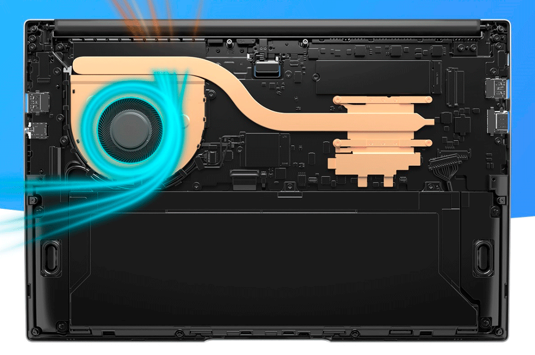 Honor MagicBook 14 оснащен системой охлаждения с одной медной тепловой трубкой, медным теплораспределителем и радиатором с турбиной. Забор воздуха происходит снизу, а его выброс — назад.