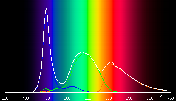 Такой спектр с относительно узким пиком синего и с широкими горбами зеленого и красного цветов характерен для экранов, в которых используется белая светодиодная подсветка с синим излучателем и желтым люминофором.