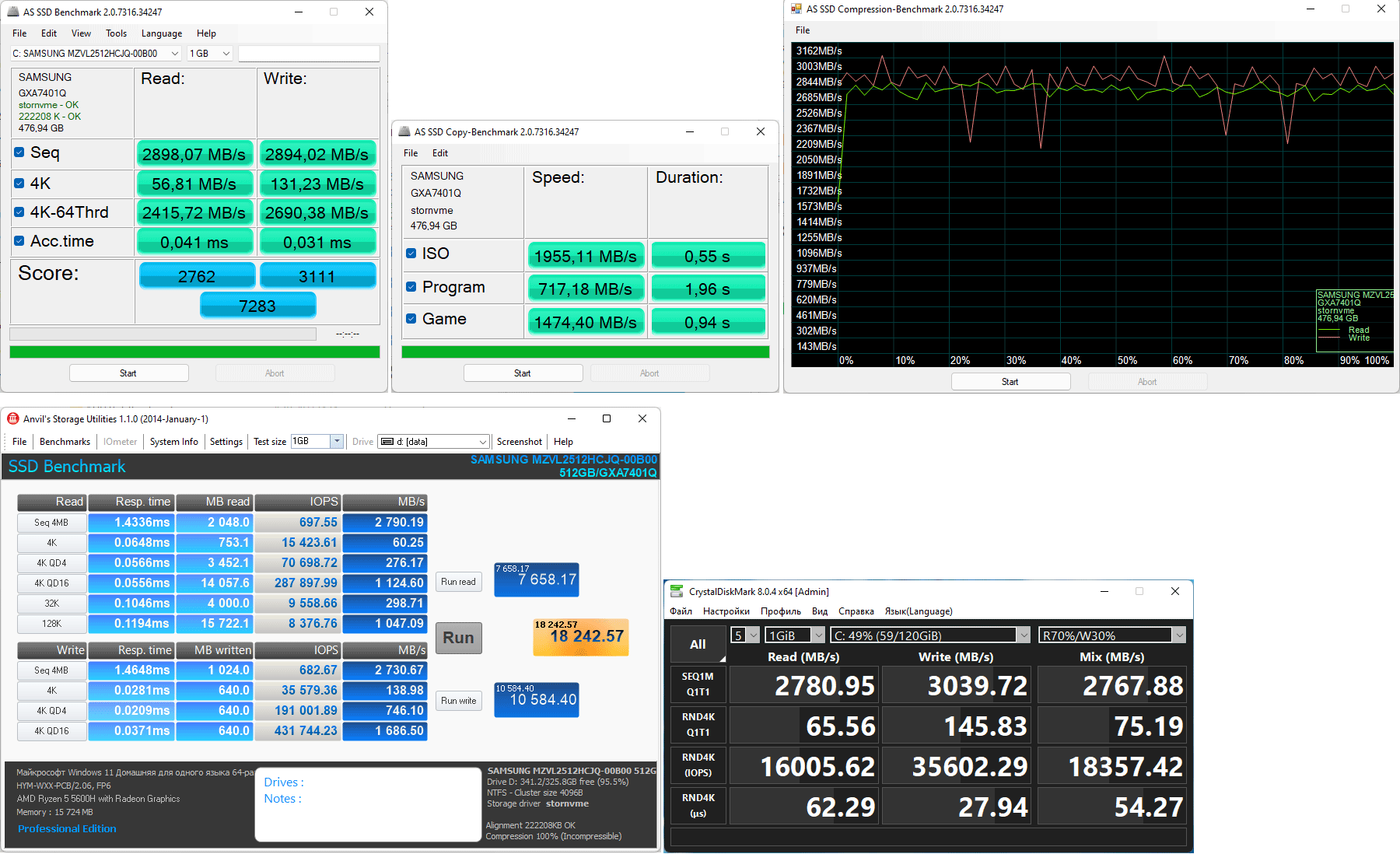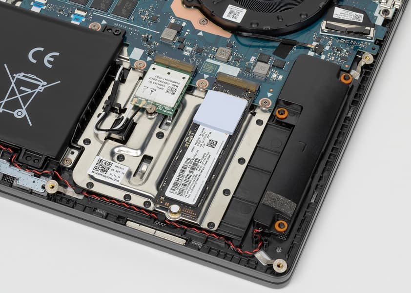 Шасси ноутбука оснащено только одним посадочным местом под накопитель (слот M.2), в котором установлен SSD с интерфейсом PCIe 3.0 x4 объемом 512 ГБ (модель Samsung MZVL2512HCJQ).