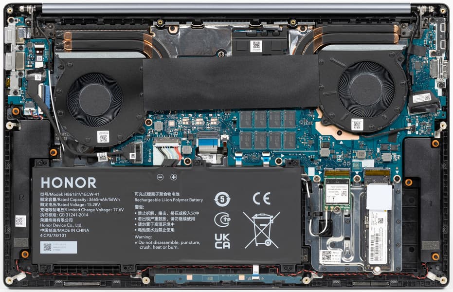 В комплекте с MagicBook 16 идет зарядное устройство мощностью 65 Вт. С его помощью ноутбук можно зарядить меньше, чем за полтора часа. Провод отсоединяемый, это обычный кабель со штекерами USB Type-C на обоих концах, никакой проприетарности, всё универсальное.