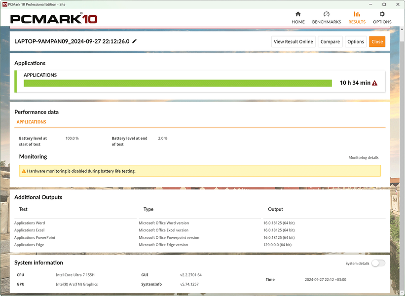 Кроме этого, мы провели дополнительные тесты автономности MagicBook Art 14 в тестовом пакете PCMark’10, получив следующие показатели.
