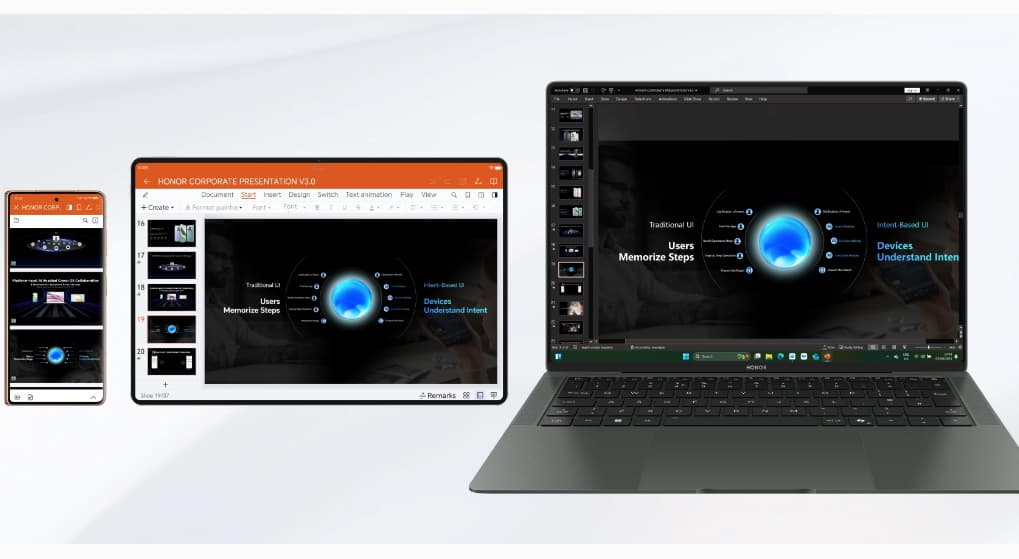 С помощью технологии Honor Share можно проецировать экран смартфона, перетаскивать файлы, отвечать на звонки или обмениваться сообщениями. Также можно проецировать экран ультрабука на телевизор или монитор, а функция «Мультиэкран» позволяет быстро передавать файлы или изображения.