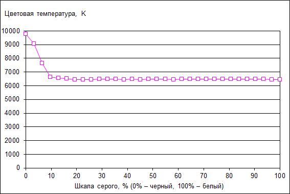 Цветовая температура ЖК-экрана ноутбука стабильна по всей шкале серого (темные области можно не учитывать из-за погрешности измерения) и составляет примерно 6500 K.