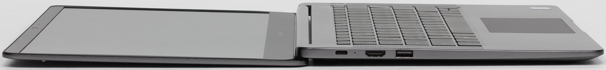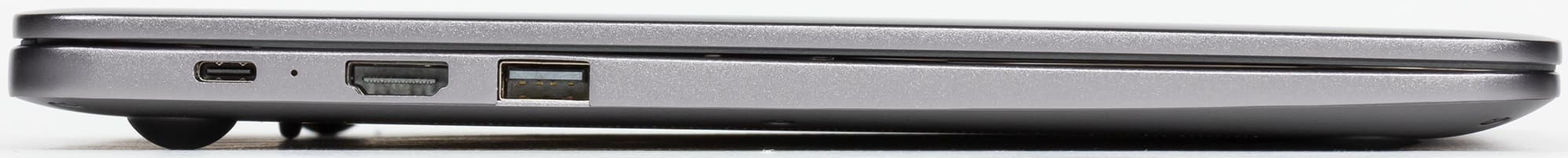На левом торце корпуса ноутбука расположены порт USB 3.0, видеовыход HDMI, порт USB Type-C для зарядки ноутбука.