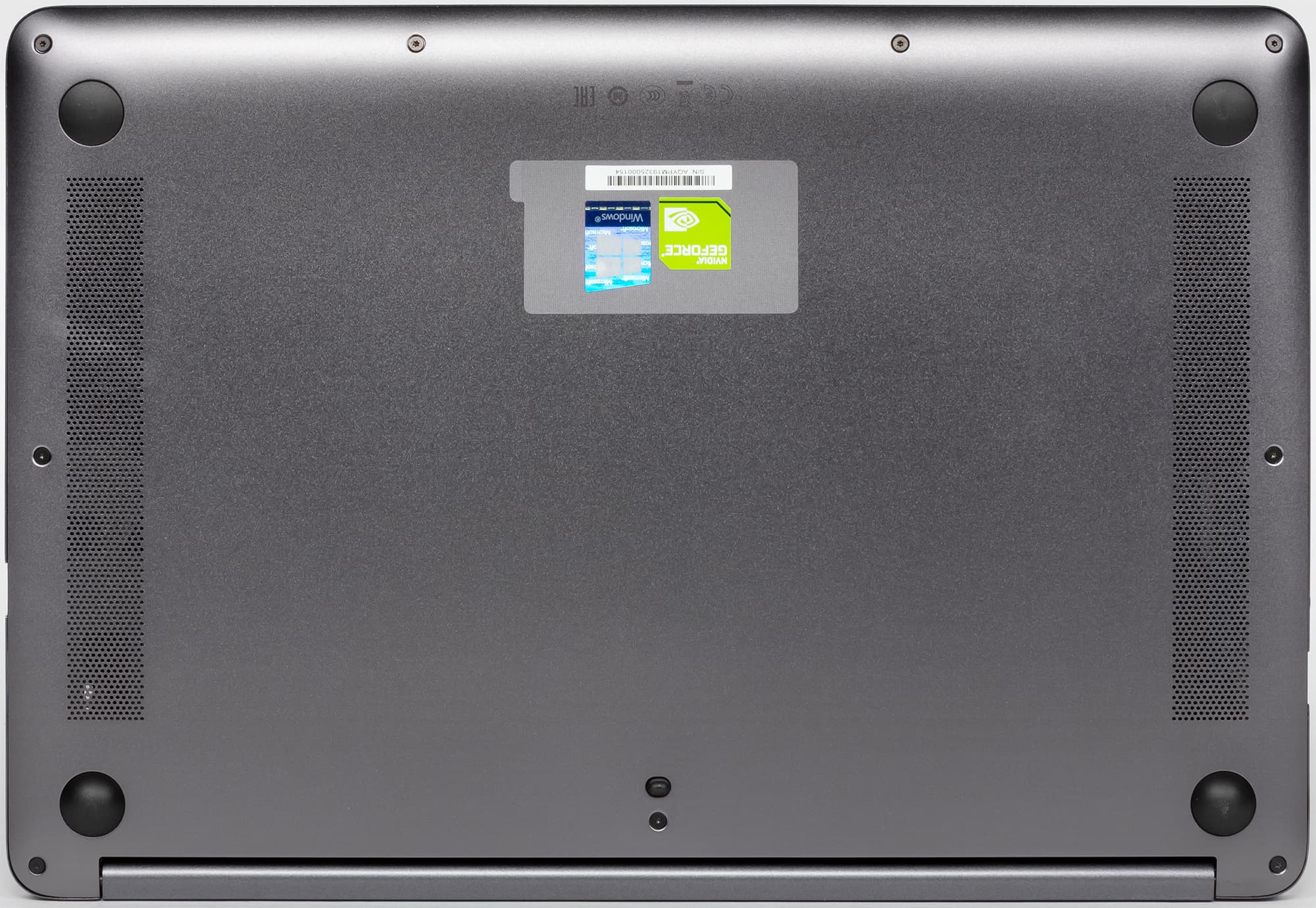 Нижняя панель корпуса точно такая же по цвету и текстуре, как и крышка. На этой панели, закругленной к краям, есть вентиляционные отверстия и резиновые вставки-ножки.