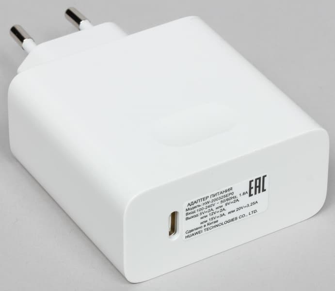 Ноутбук подключается к питанию по интерфейсу USB Type-C, а комплектный адаптер поддерживает различные выходные режимы (5 В; 2 А / 9 В; 2 А / 12 В; 2 A / 15 В; 3 А / 20 В; 3,25 А), и его можно использовать для зарядки и других устройств.