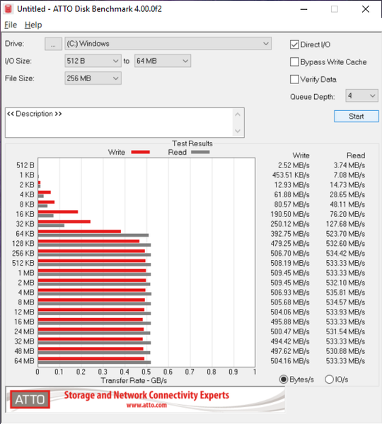 Утилита ATTO Disk Benchmark 4.00 определяет его максимальную скорость последовательного чтения на уровне 533 Мбит/с, а скорость последовательной записи — на уровне 500 Мбит/с, что вполне типично для SSD накопителей c интерфейсом SATA 6 Гбит/с.