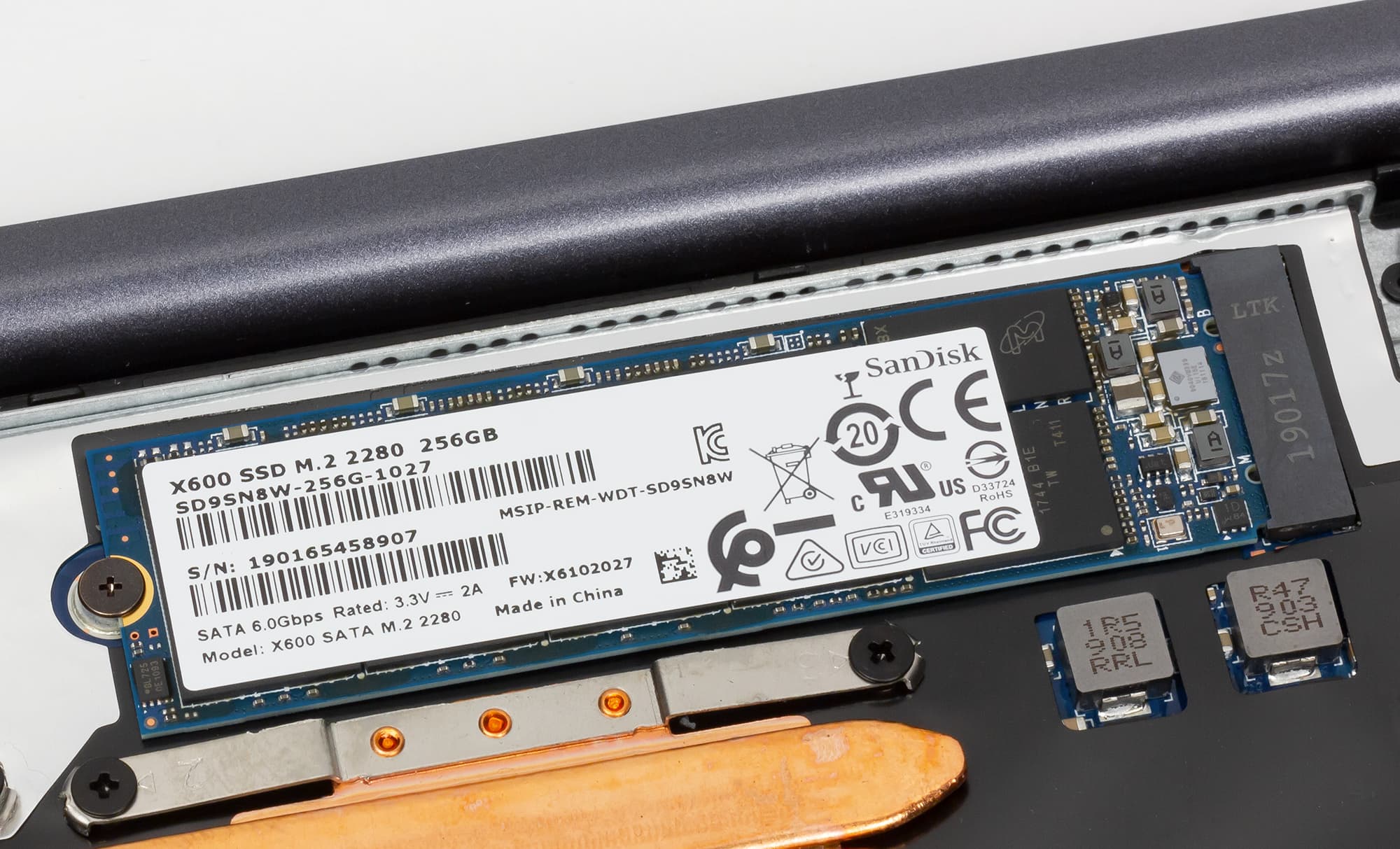 Подсистема хранения данных в ноутбуке представляет собой SSD-накопитель SanDisk X600 SD9SN8W-256G-1027 с форм-фактором 2280. Этот накопитель имеет интерфейс SATA 6 Гбит/с.