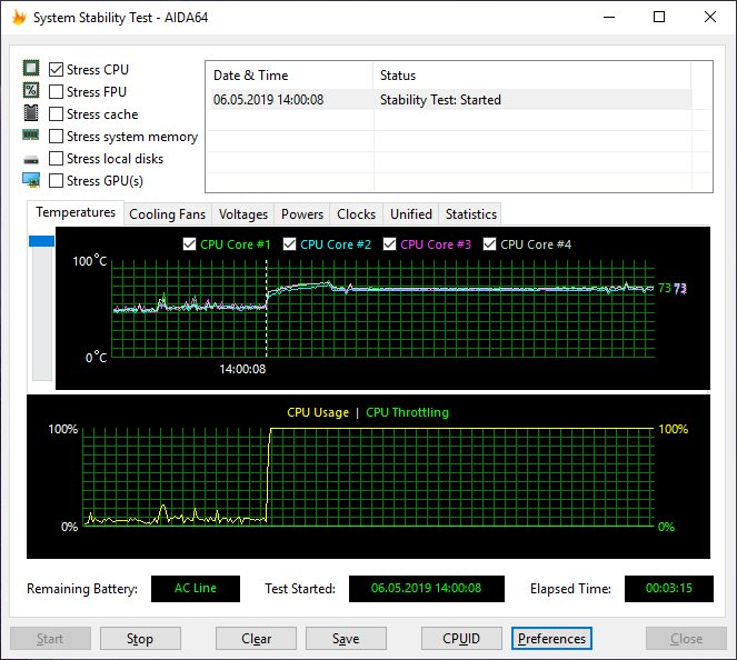 Температура ядер процессора в данном режиме точно такая же, как и в предыдущем случае, то есть стабилизируется на уровне 73 °C, а мощность энергопотребления составляет 16 Вт.