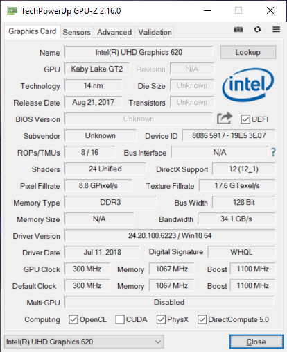 Итак, основой аппаратной конфигурации ноутбука Honor MagicBook Intel (VLT-W50) является четырехъядерный процессор Intel Core i5-8250U (Kaby Lake R). Он имеет номинальную тактовую частоту 1,6 ГГц, которая в режиме Turbo Boost может повышаться до 3,4 ГГц. Процессор поддерживает технологию Hyper-Threading. Размер его кэша L3 составляет 6 МБ, а TDP — 15 Вт. В этот процессор интегрировано графическое ядро Intel UHD Graphics 620.