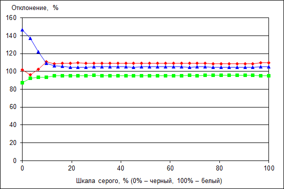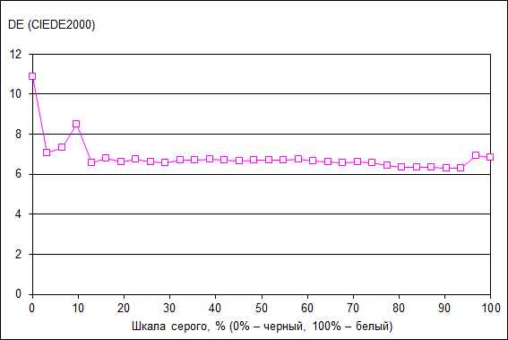 Что касается точности цветопередачи (дельта Е), то ее значение не превосходит 8 по всей шкале серого, что допустимо для данного класса экранов, но, в тоже время, это не очень хороший результат.