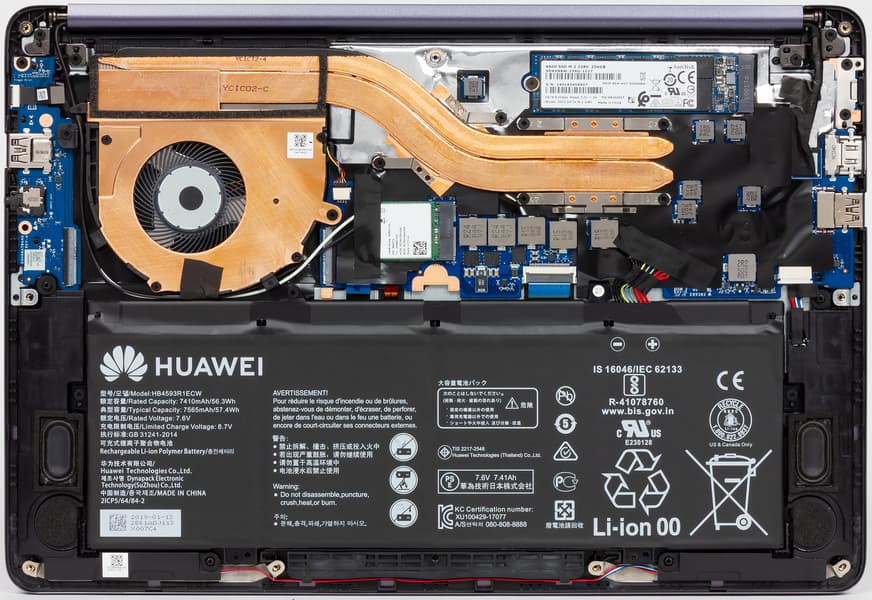 Пользователь может частично разобрать ноутбук Honor MagicBook Intel (VLT-W50). Открутив девять винтиков, можно снять нижнюю панель, это позволит получить доступ к SSD-накопителю, Wi-Fi-модулю, аккумуляторной батарее и системе охлаждения.