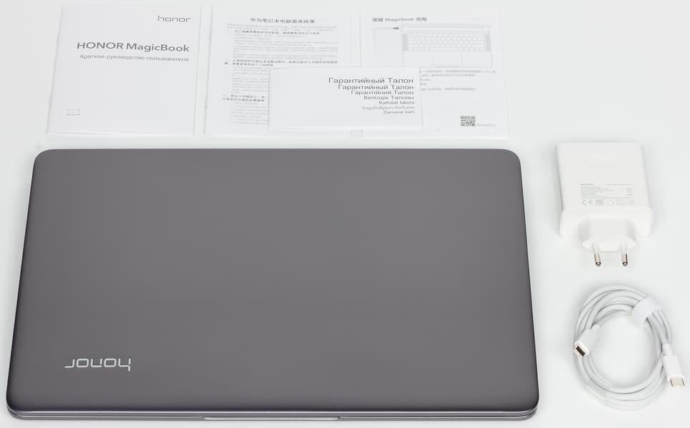 Ноутбук Honor MagicBook Intel (VLT-W50) поставляется в небольшой картонной коробке с ручкой.