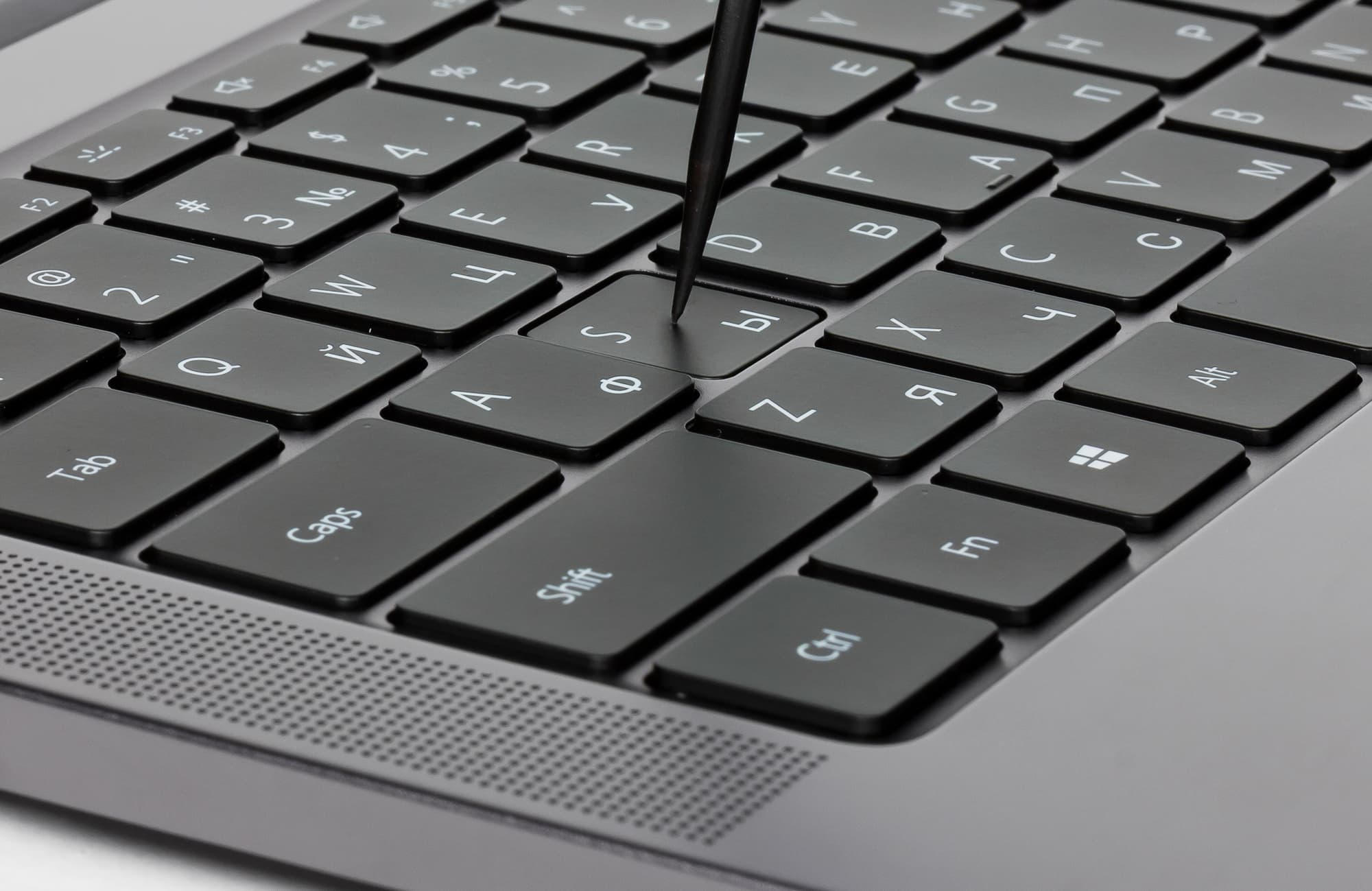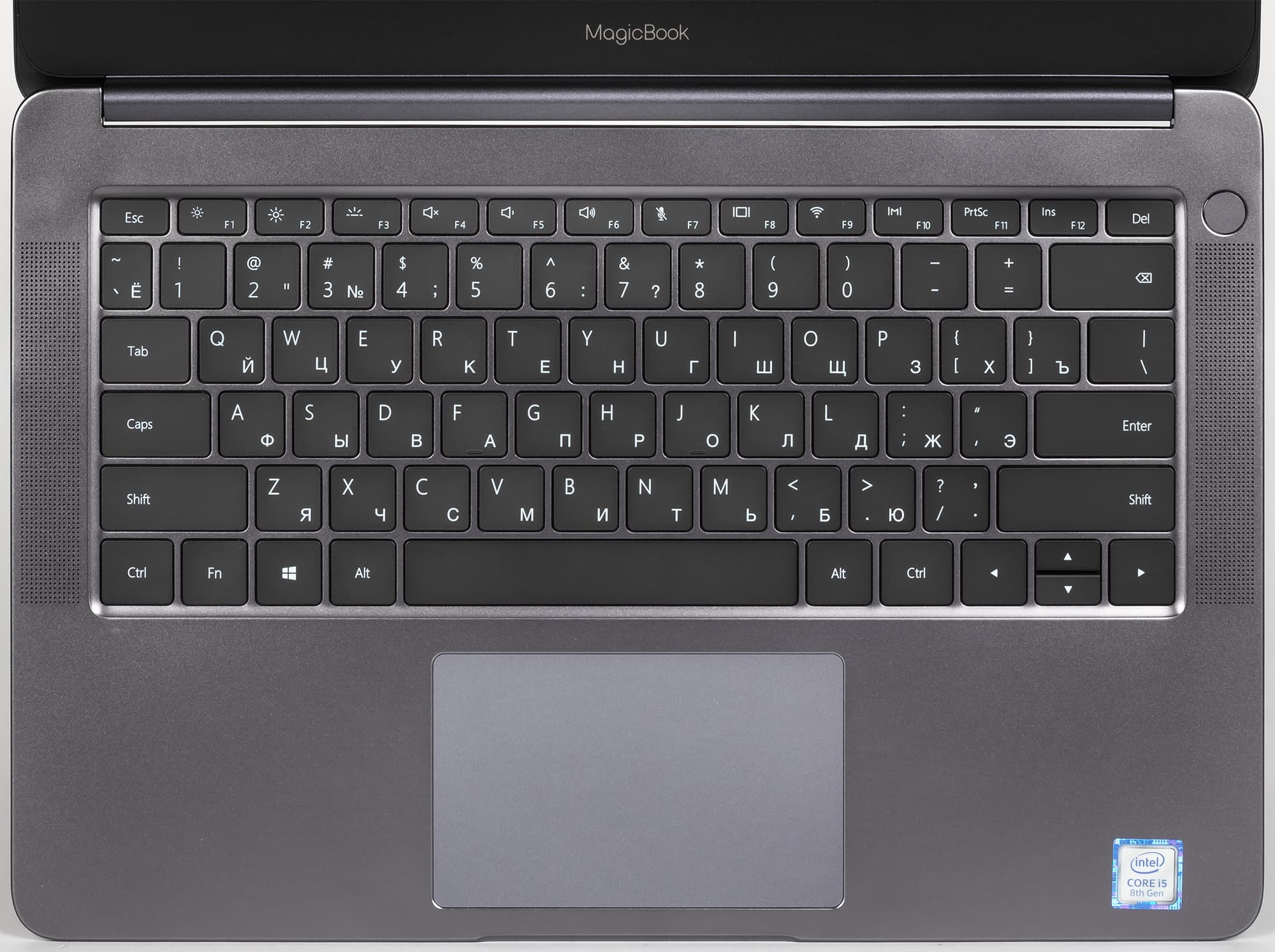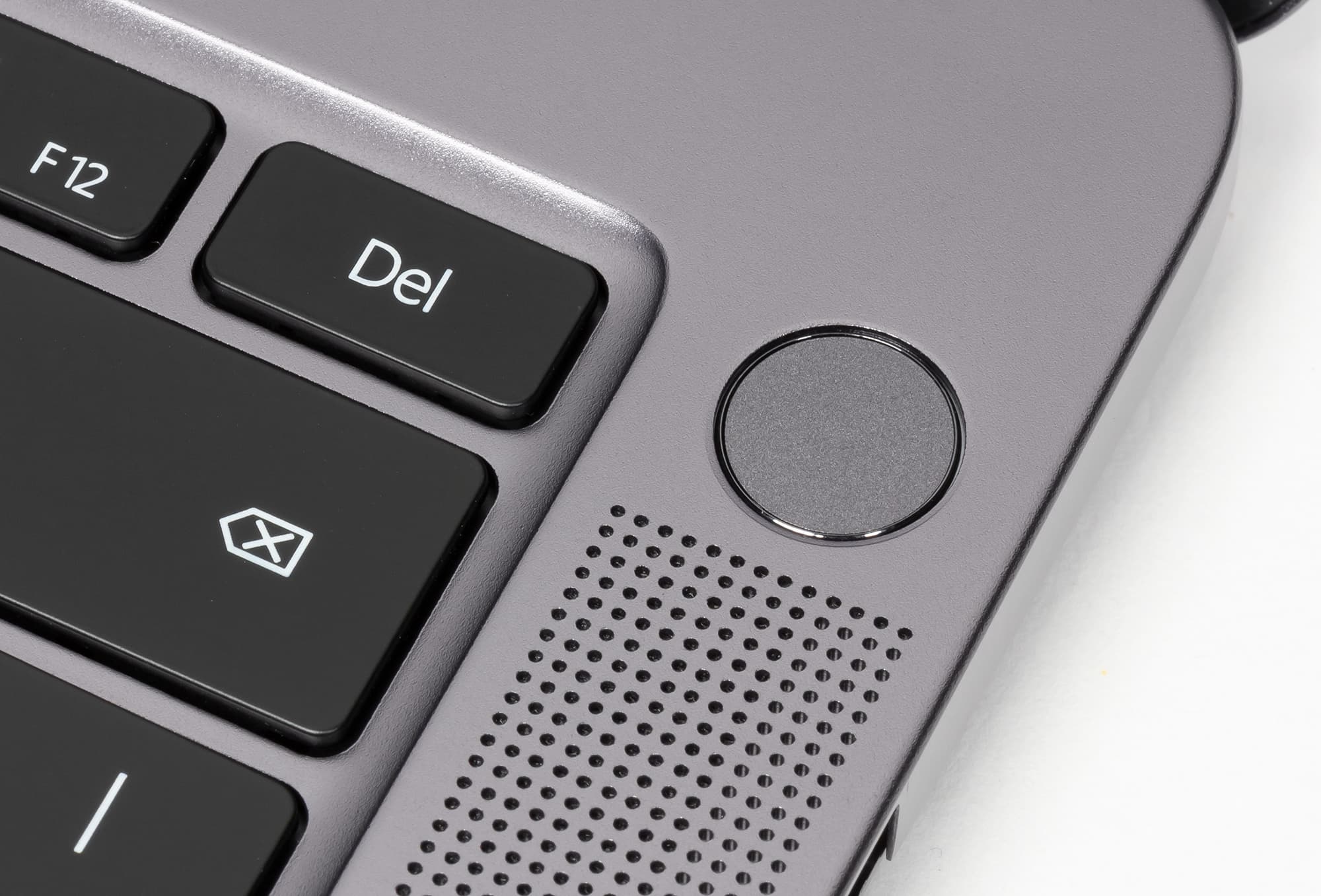 Кнопка включения питания расположена в правом верхнем углу клавиатуры. Она выполняет также и функцию сканера отпечатков пальцев с поддержкой функции Windows Hello.