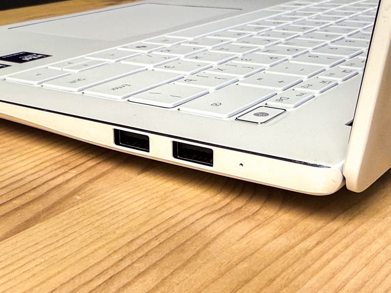 Все варианты цветов корпуса — сдержанные. У нас на тесте белый вариант (официально — «ледяной белый»), и можно сказать, что отпечатки пальцев на нём едва заметны (но под яркими лампами заметны, это видно на фото). Также ноутбук будет продаваться в России в уже ставшем классическим цвете «космический серый».
