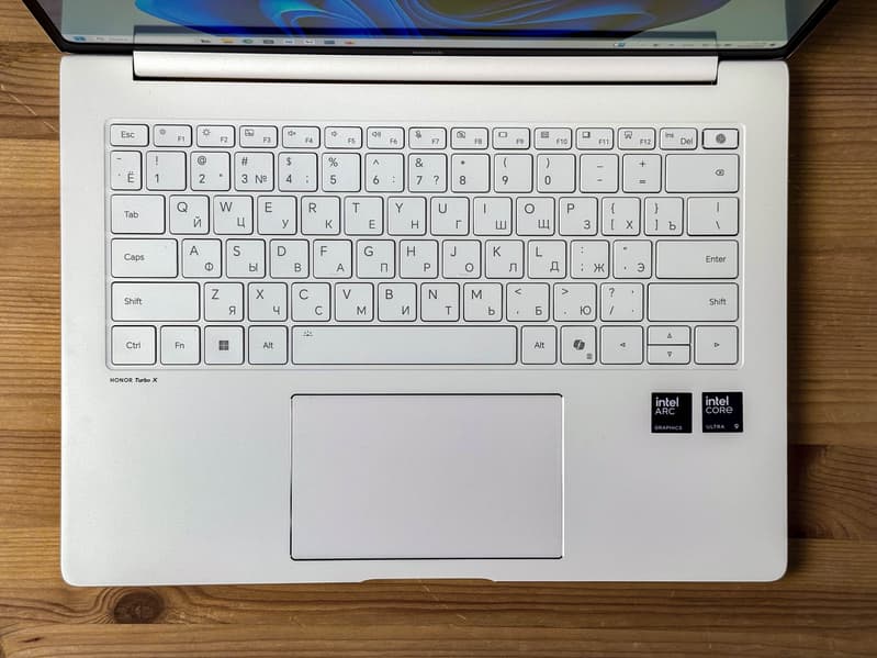 Клавиатура — без цифрового блока. Разумеется, есть подсветка. Имеется клавиша Copilot — в России бесполезная. Кнопка питания совмещена со сканером отпечатков. Печатать приятно.