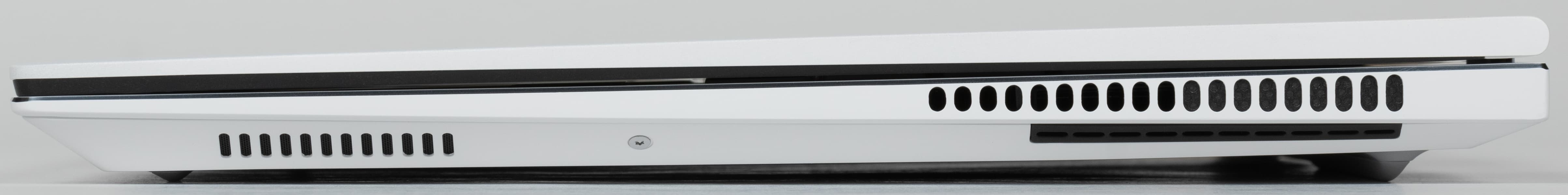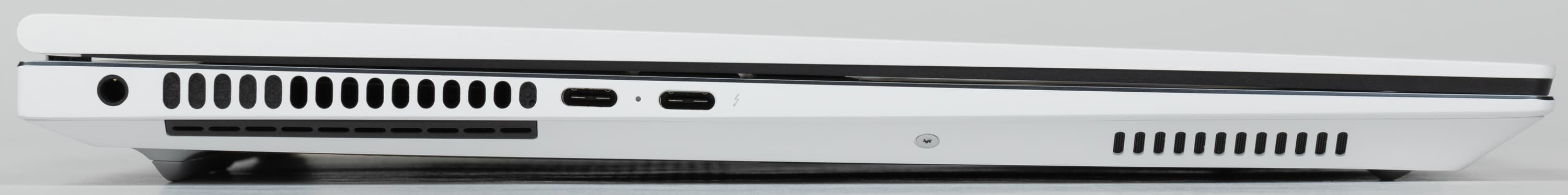 На левой боковой панели имеются мини-джек 3,5 мм для аудиогарнитуры, еще одна решетка выходного отверстия системы охлаждения и два порта Thunderbolt 4.