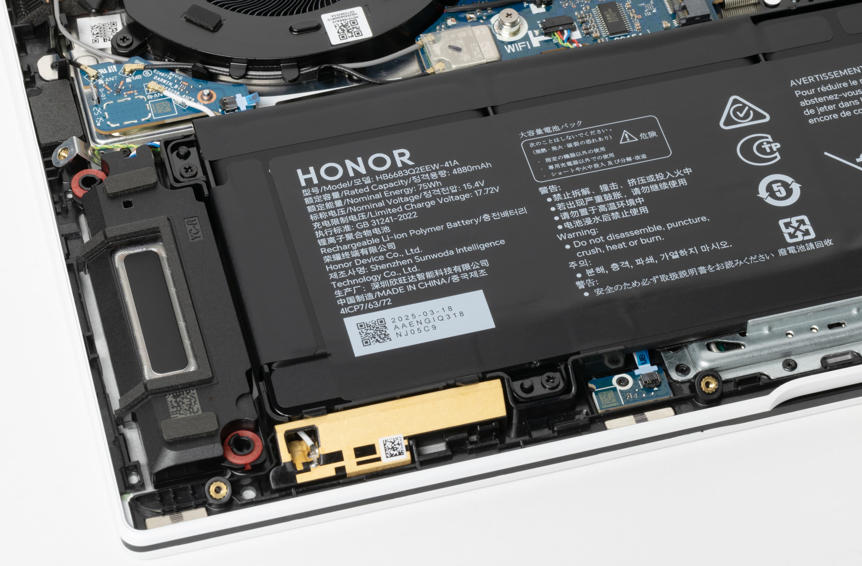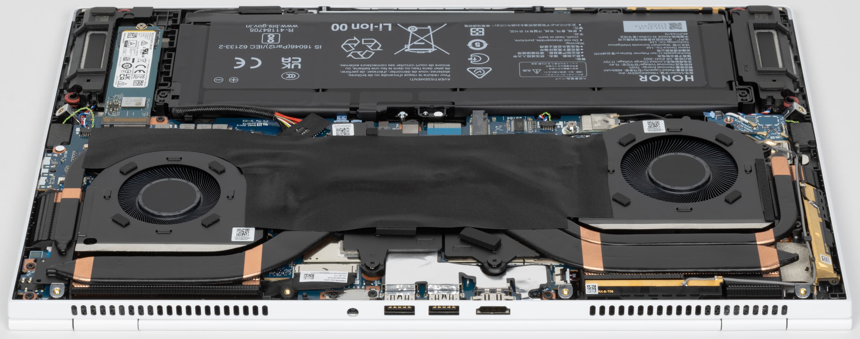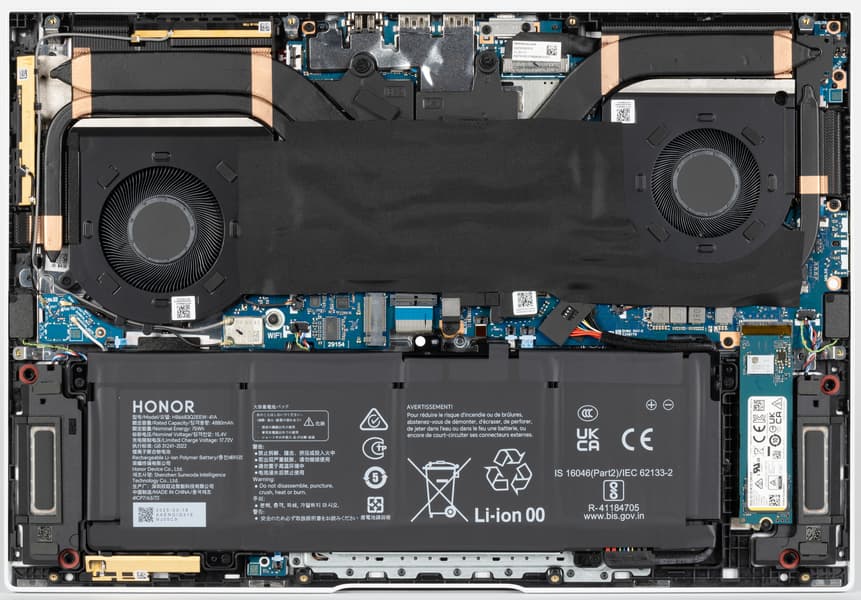 Honor MagicBook Pro 16 Hunter располагает беспроводным адаптером непривычного форм-фактора, характерного более для планшетов, чем для ноутбуков. Это трехдиапазонный (2,4/5/6 ГГц) Intel AX211D2W, соответствующий классу Wi-Fi 6E и поддерживающий стандарты IEEE 802.11ax. К сожалению адаптер распаян на системной плате, а не установленный в слоте M.2. Хоть и не новый, это вполне состоятельный вариант, однако заменить его на нечто более совершенное не удастся. Такой «аппаратный фатализм», разумеется, не радует.