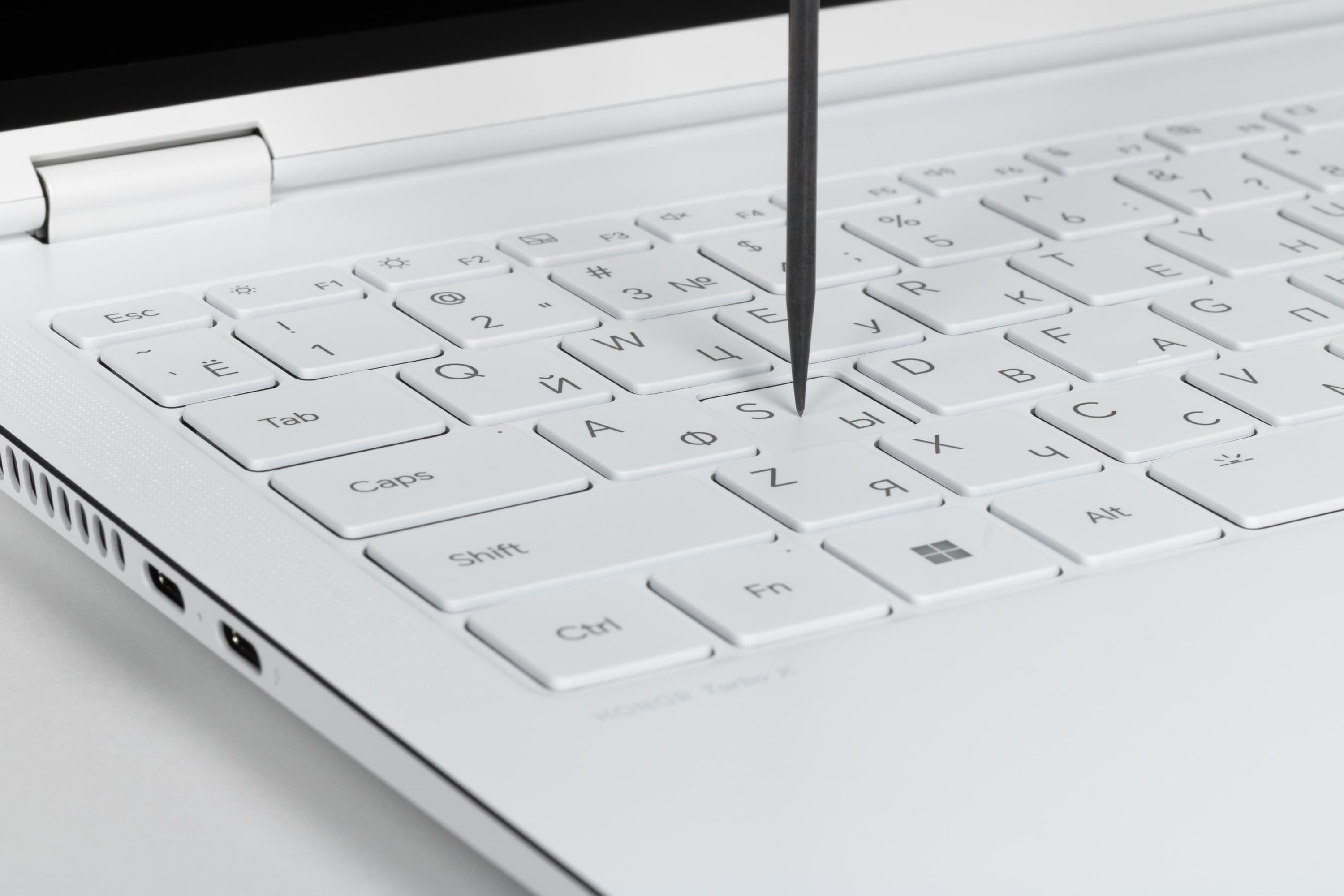 Спереди заметен ранее упомянутый уступ, облегчающий раскрытие ноутбука.
