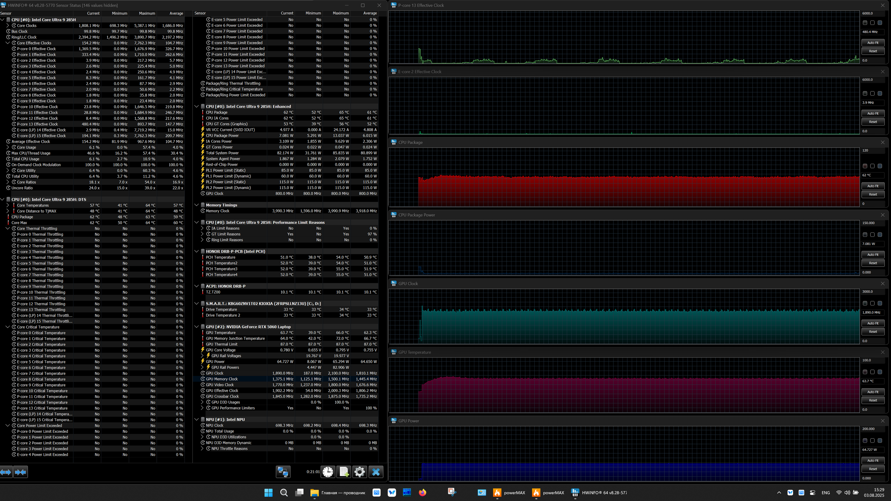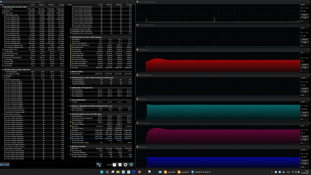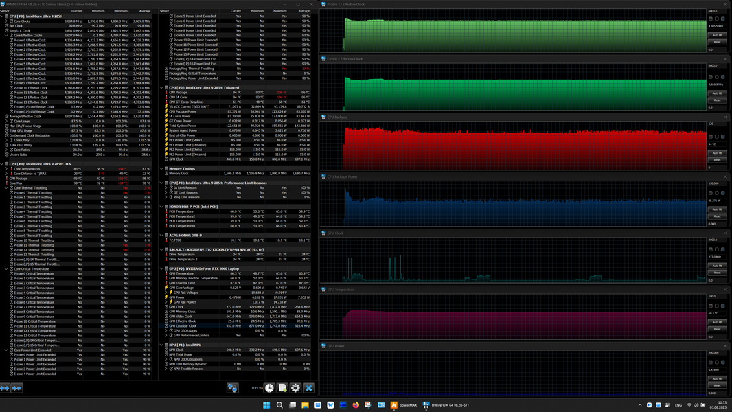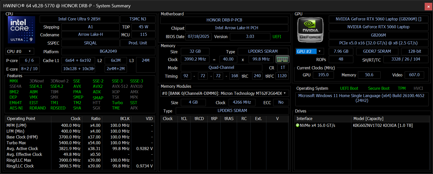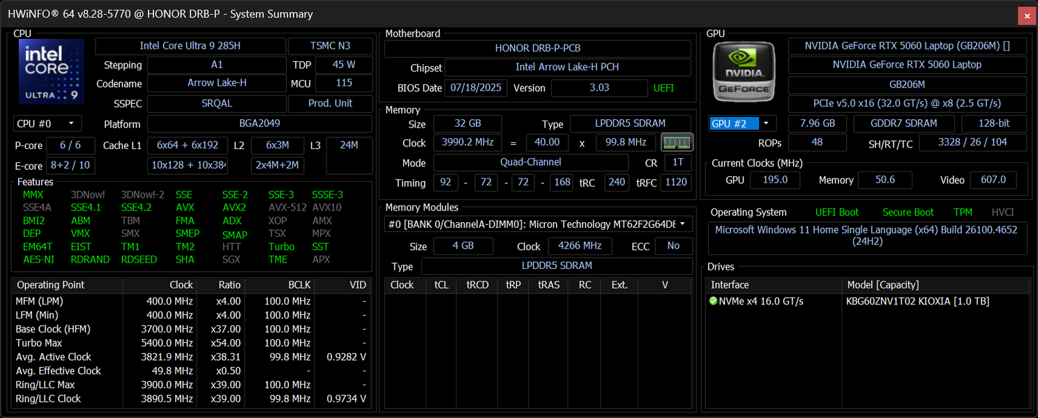 | Процессор | Intel Core Ultra 9 285H: 6 P-ядер 2,9 ГГц (Turbo 5,4 ГГц), 10 E-ядер 2,7 ГГц (Turbo 4,5 ГГц) (включая два E-ядра Low Power 1,0/2,5 ГГц); TDP 35—45 Вт (115 Вт), Tjmax 105 °C;, нейронный вычислительный блок (NPU AI Boost, 13 TOPS) | |