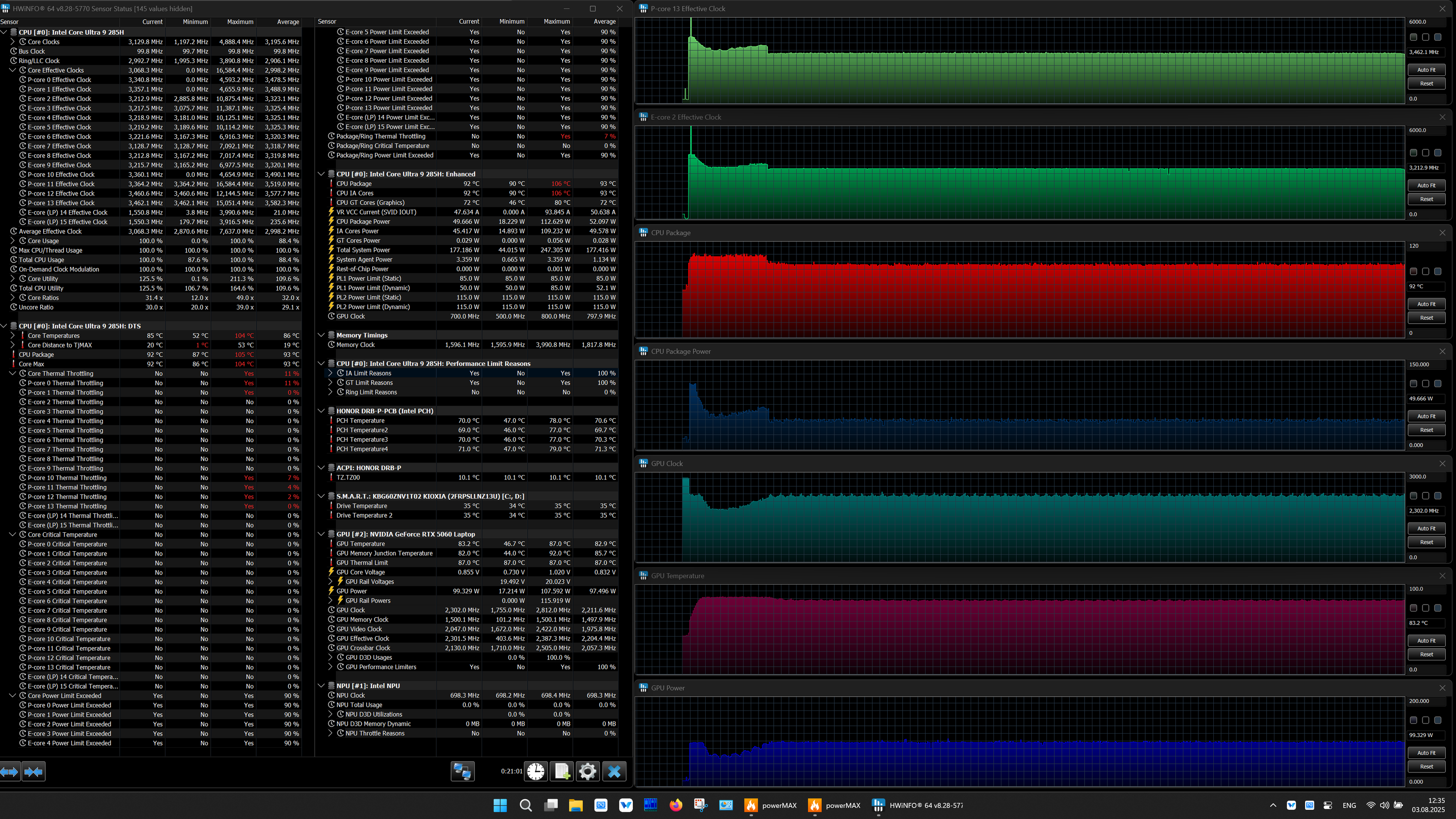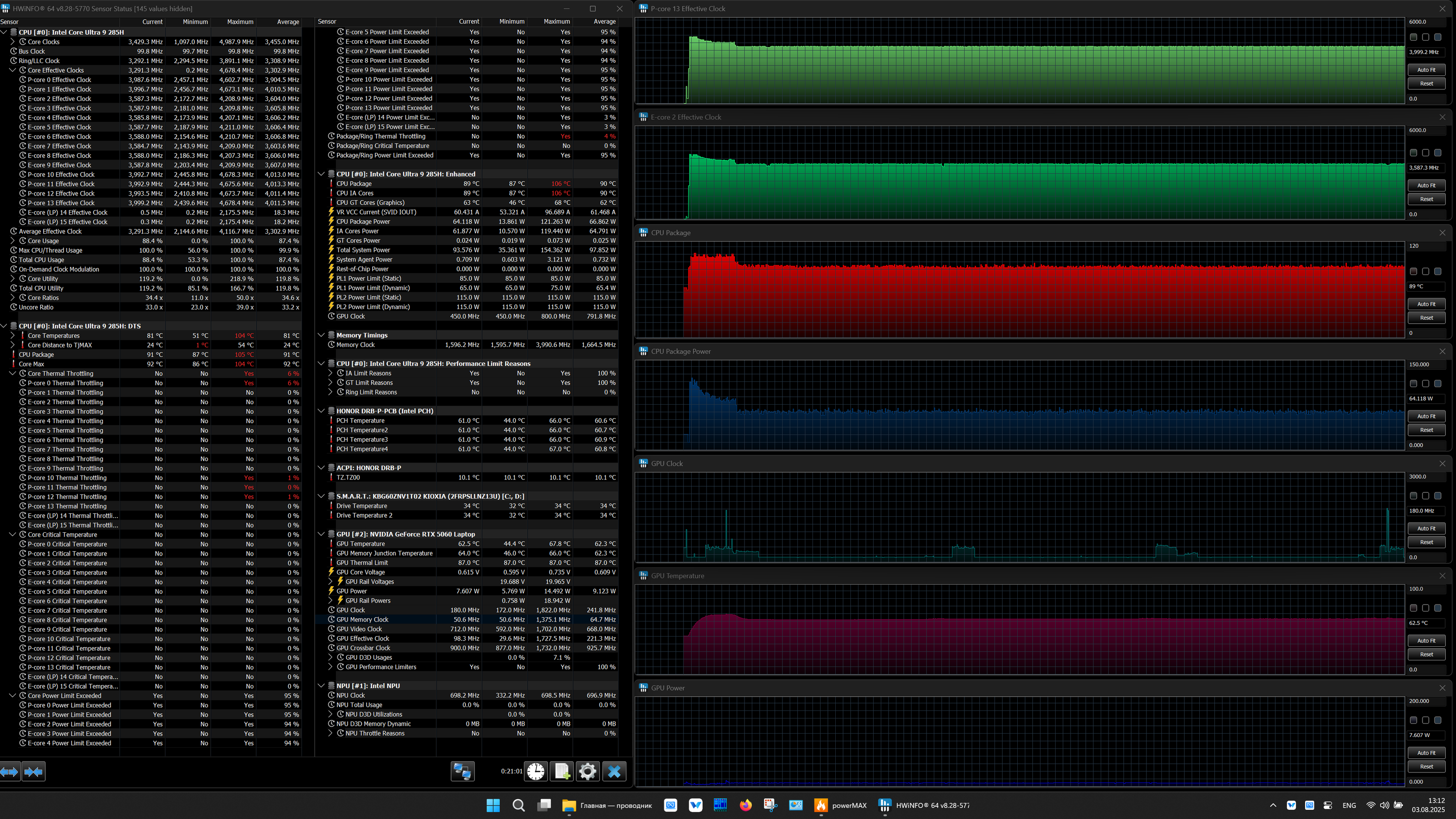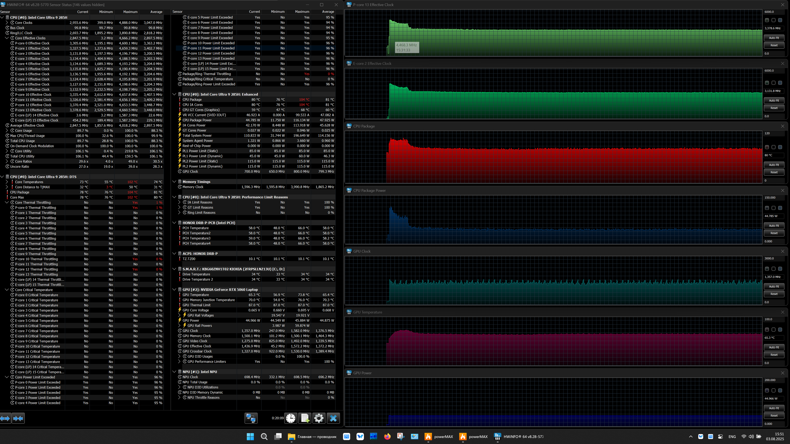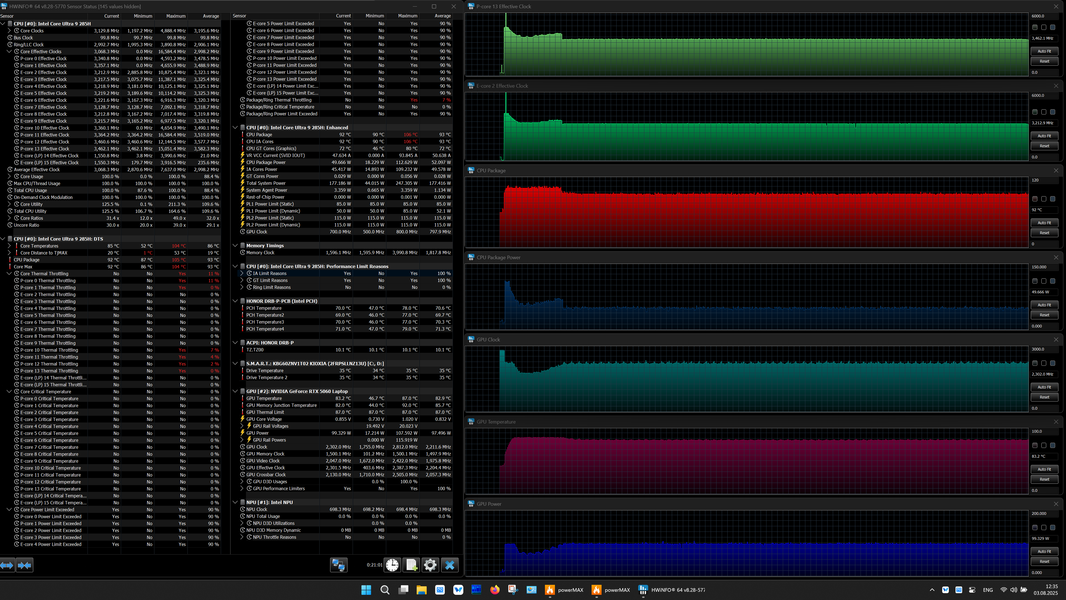 | Процессор | Intel Core Ultra 9 285H: 6 P-ядер 2,9 ГГц (Turbo 5,4 ГГц), 10 E-ядер 2,7 ГГц (Turbo 4,5 ГГц) (включая два E-ядра Low Power 1,0/2,5 ГГц); TDP 35—45 Вт (115 Вт), Tjmax 105 °C;, нейронный вычислительный блок (NPU AI Boost, 13 TOPS) | |