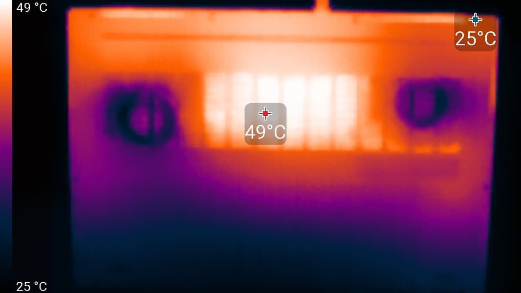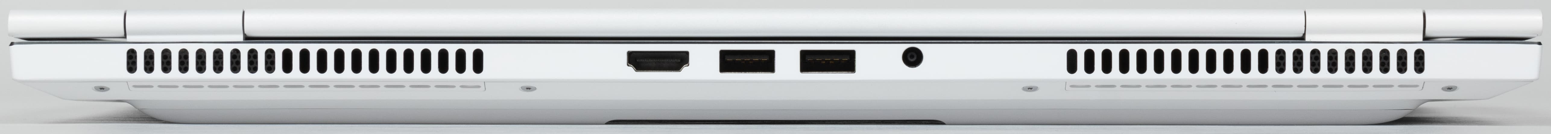 На задней панели справа и слева расположена решетки, через которые из внутреннего объема наружу выбрасывается нагретый воздух. Между ними помещаются видеовыход HDMI, два порта USB 3.2 Gen2 и коаксиальный разъем для подключения блока питания.