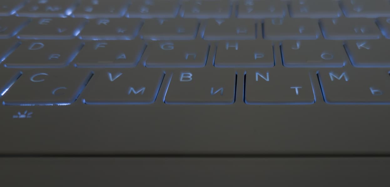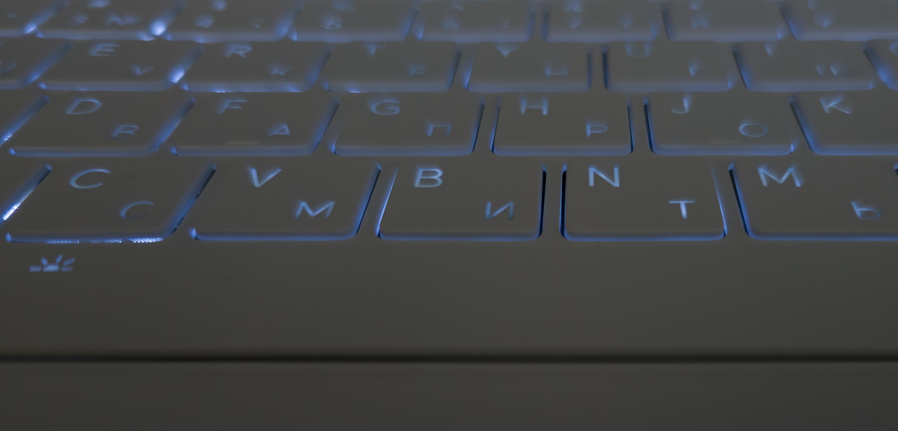 Клавиатура снабжена одноцветной подсветкой в двумя уровнями по яркости (третье состояние — подсветка выключена). Переключение производится последовательными нажатиями Fn + Пробел. Подсвечиваются сами символы и немного — их контуры. Видимость в полной темноте хорошая, в полумраке — посредственная. Зона подсветки под каждой клавишей видна, но она не бросается в глаза и потому не раздражает. Распределение света и специфика маркировки позволяют разглядеть и латинские символы, и кириллицу.