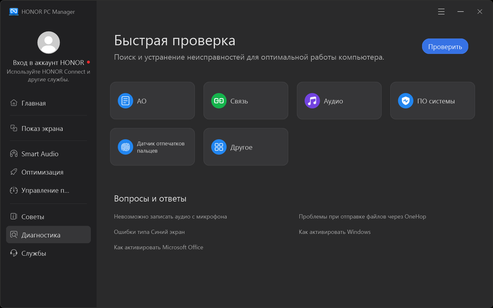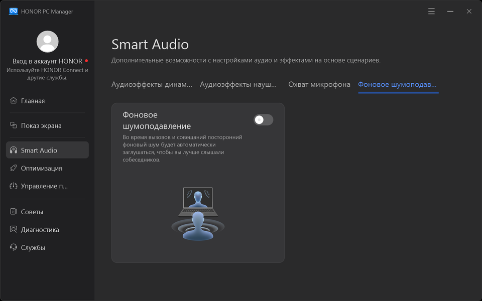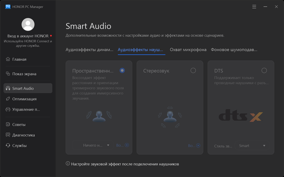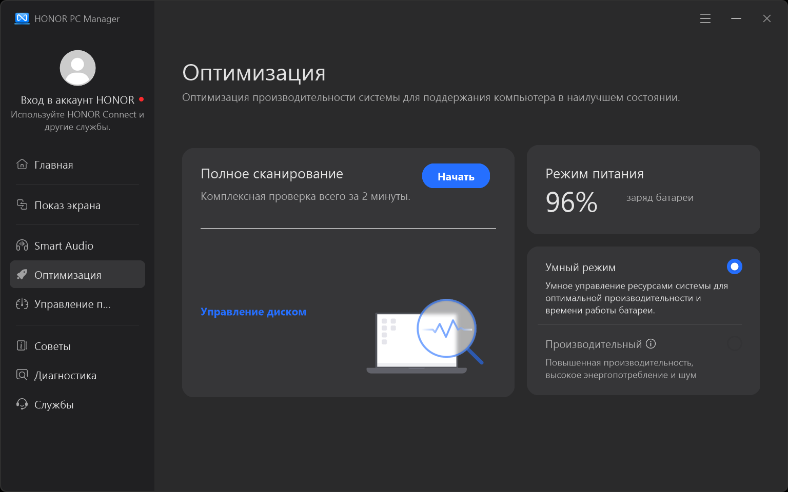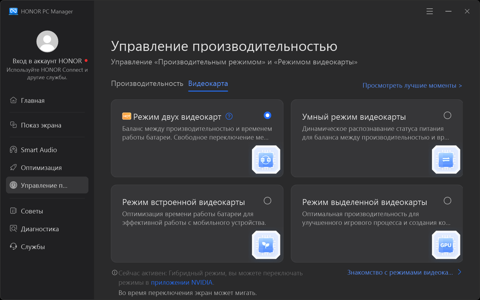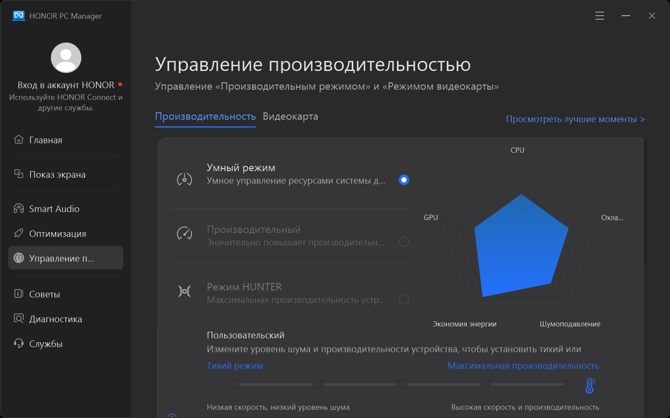 Фирменная утилита Honor PC Manager представляет наибольшую ценность при испытаниях машины, поскольку дает возможность настраивать разные параметры и выбирать сценарии (профили, пресеты) работы с разными уровнями производительности.