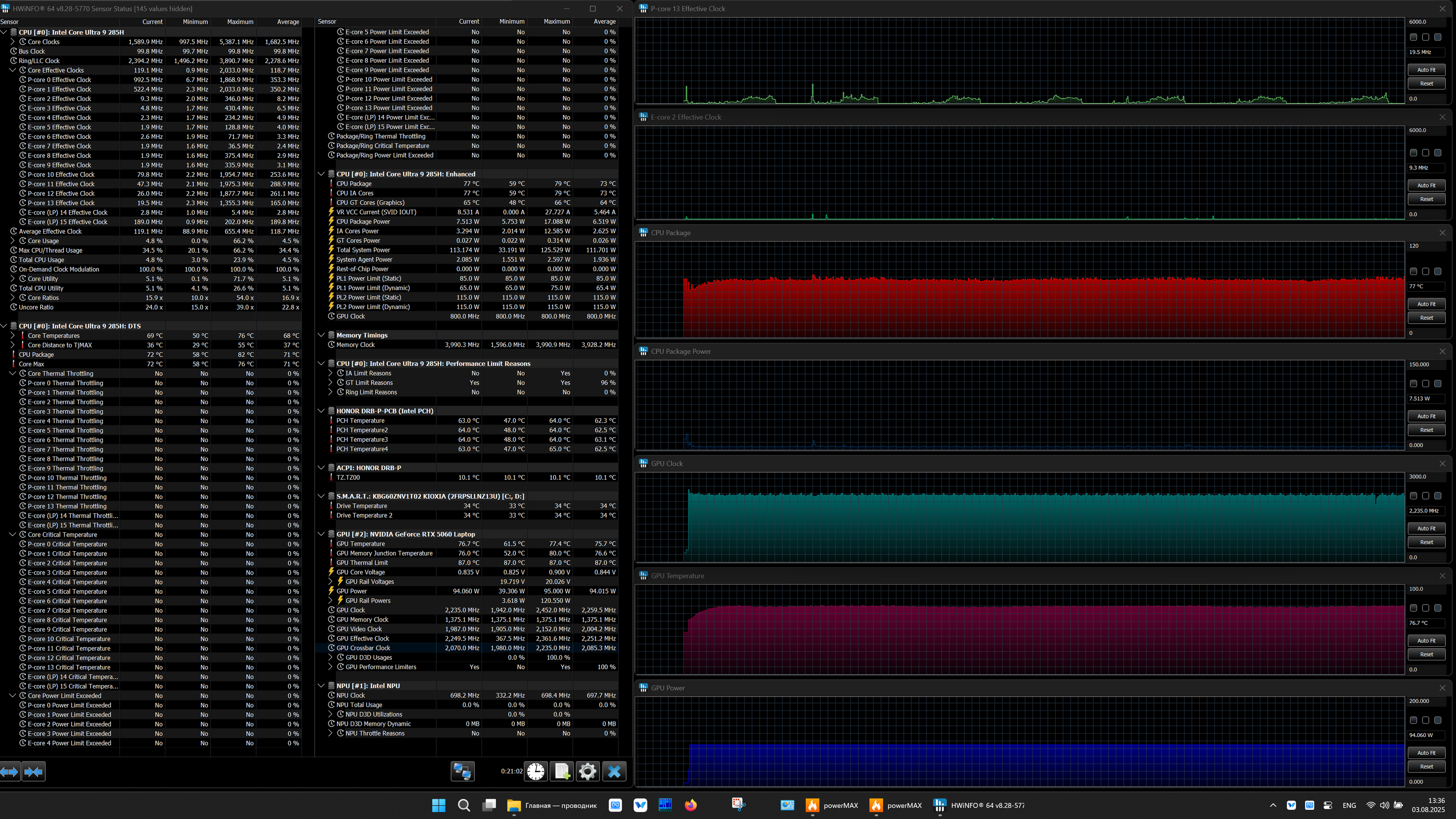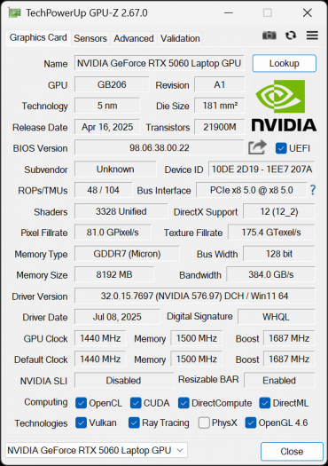 | Видеоподсистема | интегрированная: Intel Arc Graphics 140T (8 исп. блоков, до 2,35 ГГц, до 35 Вт) дискретная: Nvidia GeForce RTX 5060 Laptop с 8 ГБ GDDR7 (до 2,5 ГГц, 100 Вт) | |