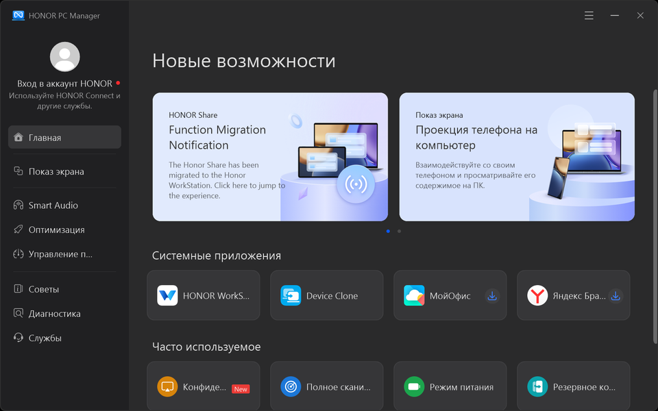 Honor MagicBook Pro 16 Hunter поставляется с Windows 11 Home, триал-версией Microsoft Office 365, сетап-инициатором Яндекс и фирменными утилитами Honor Workstation и Honor PC Manager.