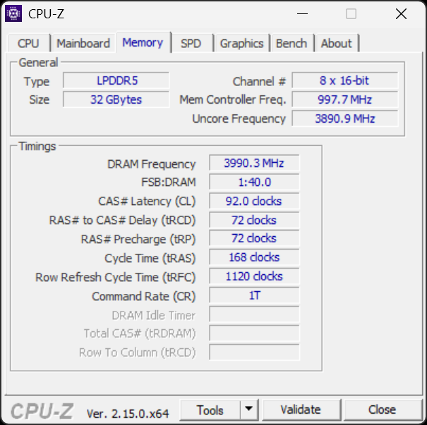 Внутри по размерам доминируют система охлаждения и аккумулятор. Теплосъемный агрегат вместе с теплотрубками почему-то заклеен подручными средствами. Аппаратная модернизация предусматривает возможность добавления одного дополнительного NVMe-устройства в свободный слот M.2 (но лишь вдвое более короткого, чем системный накопитель), а также замену аккумулятора. Оперативная память не подлежит замене. Уточним ее скоростные показатели при помощи пакета AIDA64.