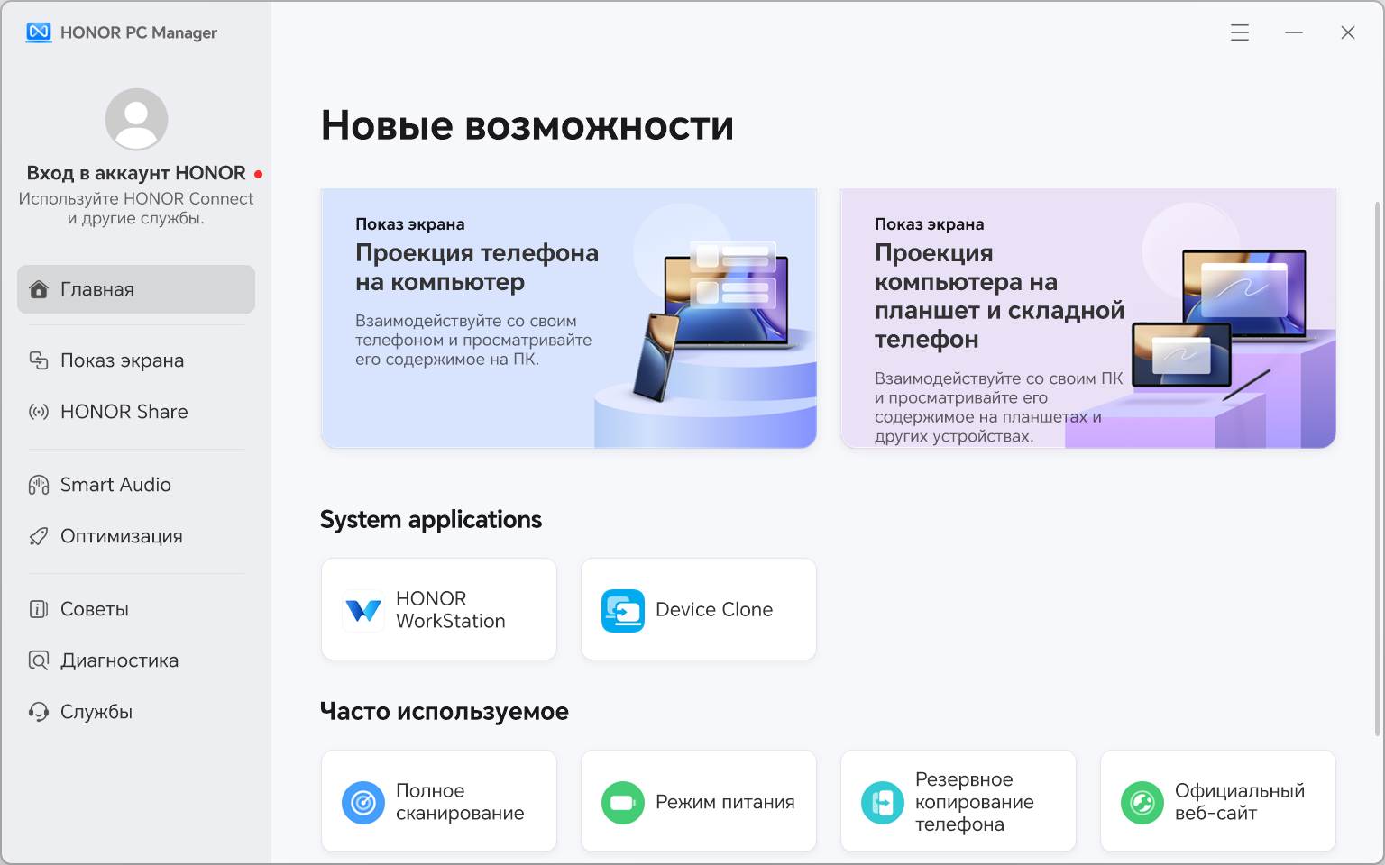 На главном экране имеются отсылки к другим утилитам (Honor Workstation и Device Clone), а также блок «часто используемых» кнопок.