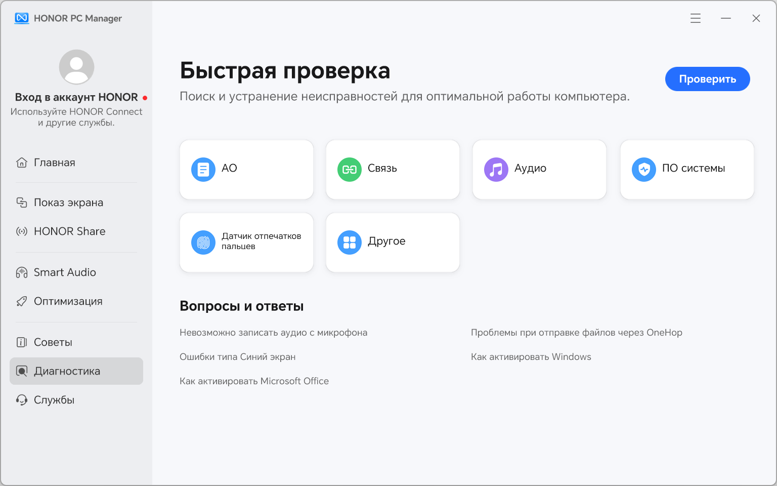 В разделе «Диагностика» имеются опции проверки текущего состояния некоторых аппаратных компонентов и способы разрешения основных проблем, которые могут возникнуть при их работе.