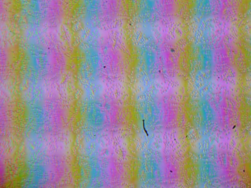 Зерно этих дефектов в несколько раз меньше размеров субпикселей (масштаб этих двух фотографий примерно одинаковый), поэтому фокусировка на микродефектах и «перескок» фокуса по субпикселям при изменении угла зрения выражены слабо, из-за этого нет и «кристаллического» эффекта.