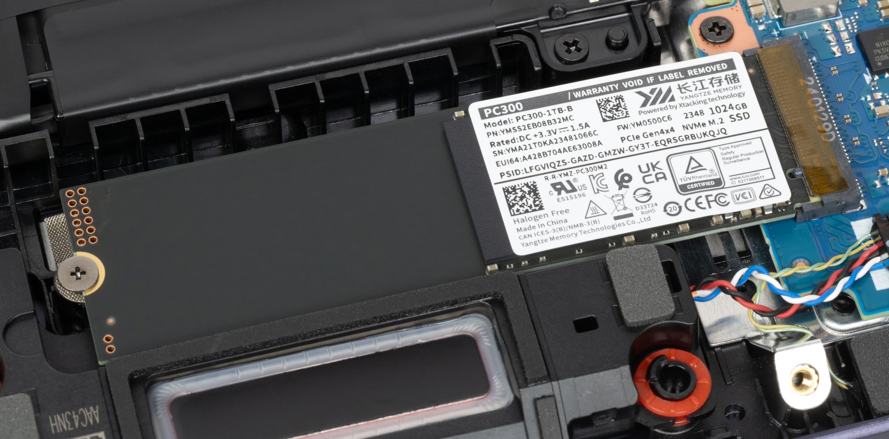 Honor MagicBook Pro 16 2024 г. располагает системным накопителем SSD Yangtze Memory PC300-1TB-B (YMSS2EB08B32MC) с неформатированной емкостью 1 ТБ (M.2, NVMe, PCIe 4.0 ×4).