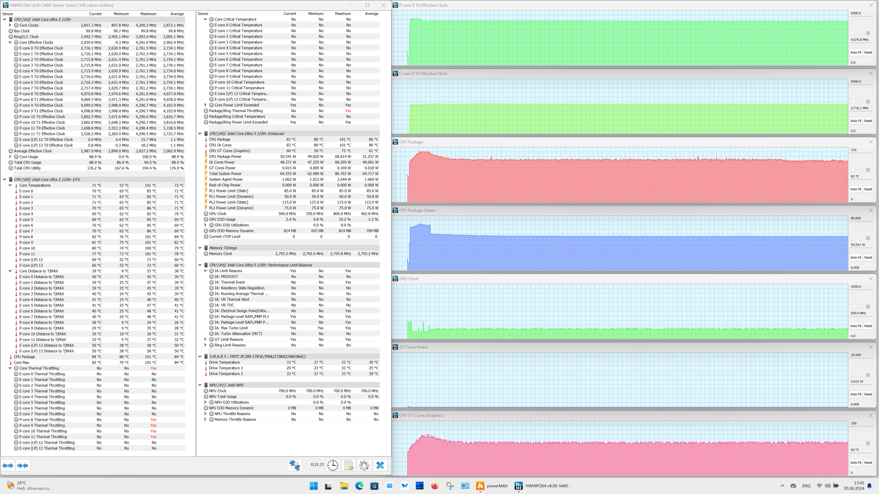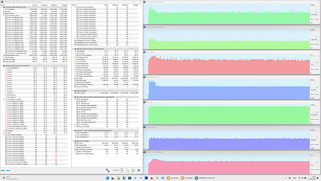 | Процессор | Intel Core Ultra 5 125H (Meteor Lake): 4 P-ядра/8 потоков при 1,2/4,5 ГГц, 8 E-ядер/8 потоков при 0,7/3,6 ГГц, 2 E-ядра LP/2 потока при 0,7/2,5 ГГц; NPU 1,4 ГГц; TDP 20—28 Вт (115 Вт при разгоне); Tjmax 110 °C | |