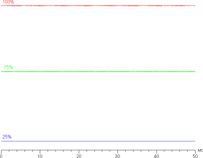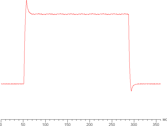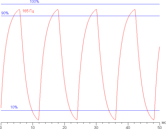 На любом уровне яркости значимая модуляция подсветки отсутствует, поэтому нет и никакого мерцания экрана (нет ШИМ). В доказательство приведем графики зависимости яркости (вертикальная ось) от времени (горизонтальная ось) при различных значениях настройки яркости: