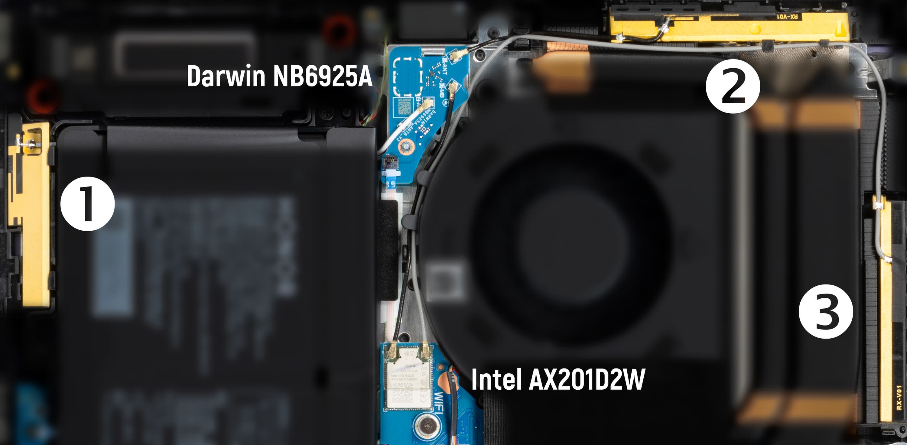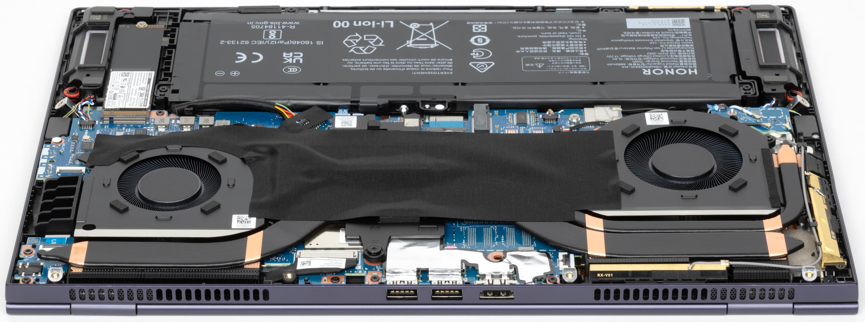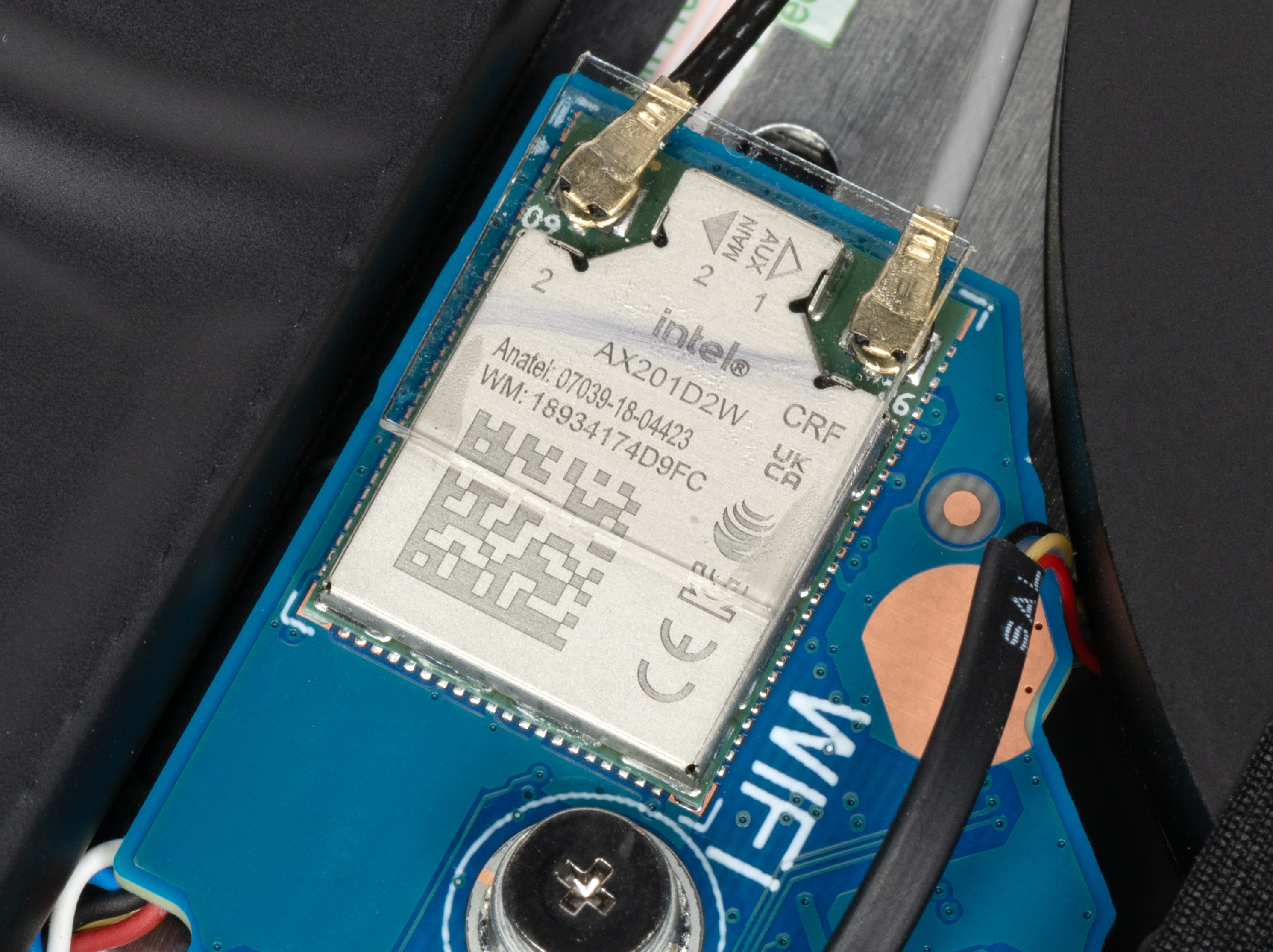 Беспроводную связь обеспечивает не самый новый, но хорошо зарекомендовавший себя двухдиапазонный (2,4/5 ГГц) адаптер Intel AX201D2W, сертифицированный как устройство Wi-Fi 6 с поддержкой стандартов IEEE 802.11ax и возможностями одновременного приема и передачи данных с использованием двух антенн при множественных подключениях (2×2 MIMO). К сожалению, он распаян на системной плате и замене не подлежит. Впрочем, это оправдано, поскольку для улучшения качества радиосоединения в Honor MagicBook Pro 16 используется дополнительное аппаратное решение, которое может и не работать с другими адаптерами Wi-Fi.