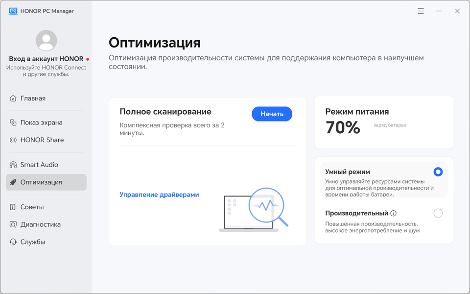 Honor PC Manager позволяет настроить некоторые системные параметры.