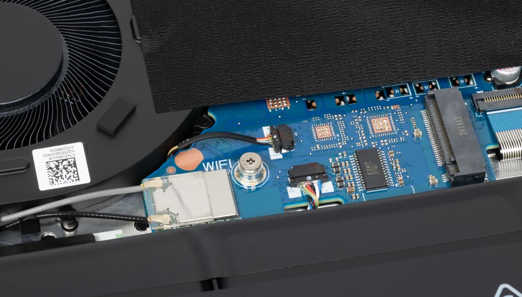 Около правого кулера имеется свободный слот M.2, в который при аппаратной модернизации можно установить дополнительный NVMe-накопитель, но лишь типоразмера 2242 (вдвое короче, чем системный).