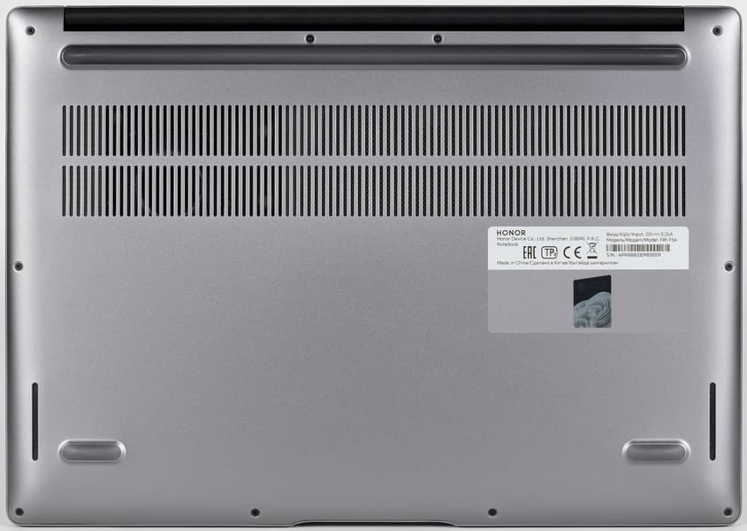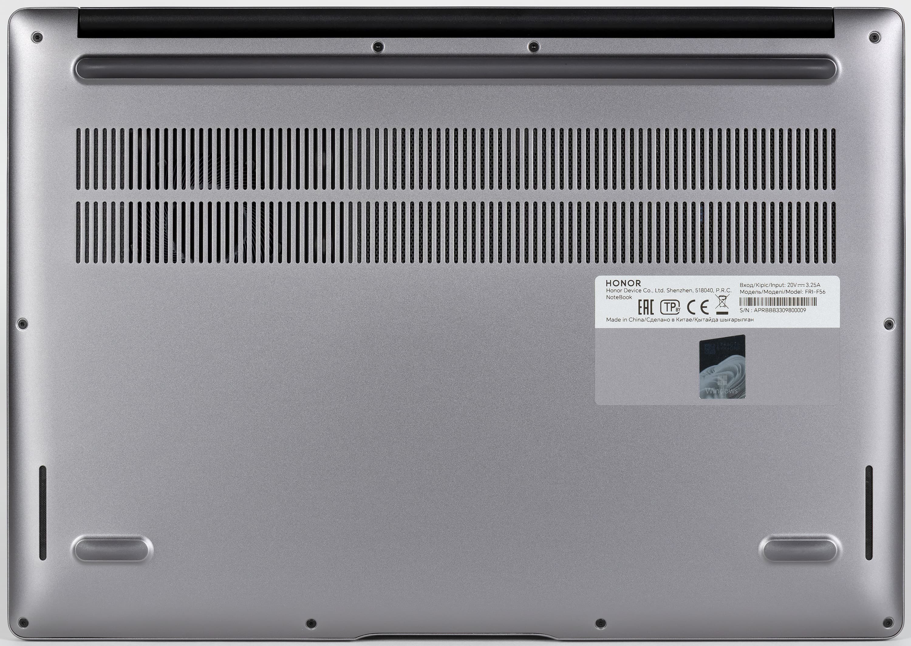 Из визуальных изменений в дизайне можем выделить три небольших момента: верхняя часть рамки экрана увеличена по высоте из-за встроенной в нее камеры (перенесена туда из кнопки на клавиатуре), кнопка включения со сканером отпечатков пальцев переехала в панель клавиатуры, а надпись «Honor» на крышке ноутбука теперь расположена строго по центру.