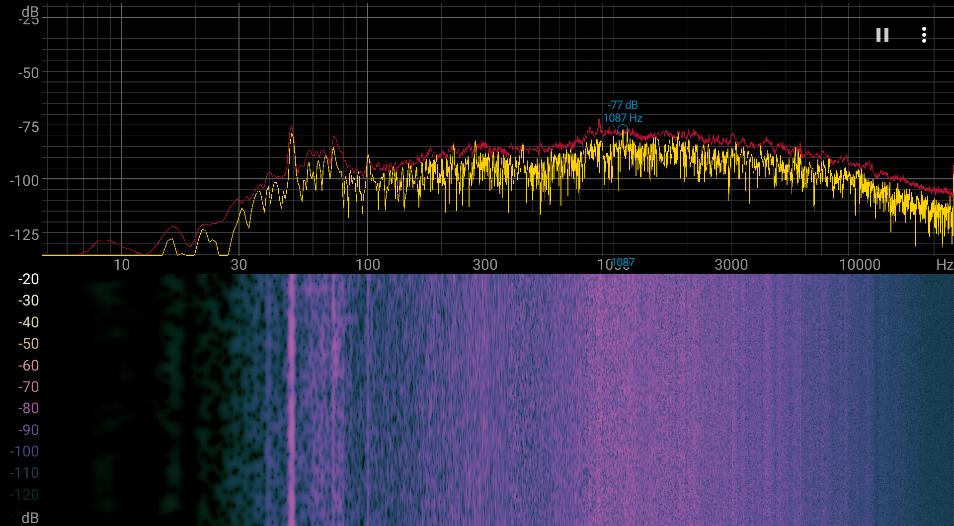 АЧХ розового шума показывает, что диапазон воспроизводимых частот неширокий, середина выпячена, а в средних высоких есть провал: