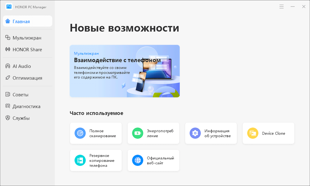 С операционной системой ноутбука Windows 11 Home установлена фирменная утилита Honor PC Manager. Она не только предоставляет пользователю всю необходимую информацию об устройстве и позволяет оперативно обновить его или обслужить, но и поможет интегрировать Honor MagicBook X 14 2023 со смартфоном или планшетом.