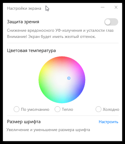 По умолчанию баланс оттенков хороший (на белом поле: цветовая температура 6400 К, а отклонение от спектра абсолютно черного тела (ΔE) — 6,3). И всё же мы попытались подправить цветовой баланс, двигая точку на цветовом круге в настройках экрана: