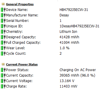 По данным HWinfo, емкость аккумулятора чуть меньше заявленной и составляет 41,4 Вт·ч.