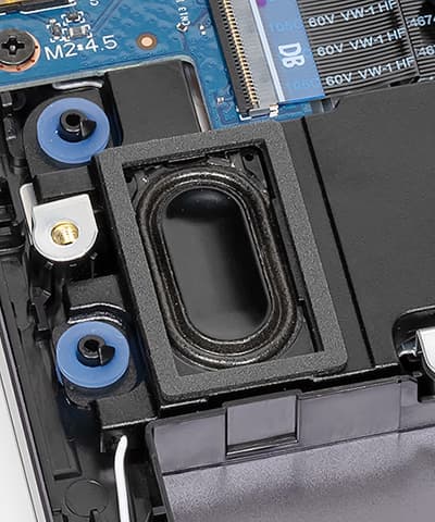 Одна тепловая трубка передает тепло от ядра процессора и его графики на медный радиатор, который охлаждается вентилятором с лопастями в форме акульих плавников.
