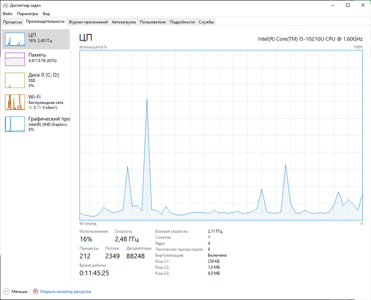 | Процессор | Intel Core i5-10210U (14 нм, 4 ядра/8 потоков, 1,6—4,2 ГГц, L3-кэш 6 МБ, TDP 25 Вт) в качестве процессора может быть установлен Intel Core i3-10110U | |