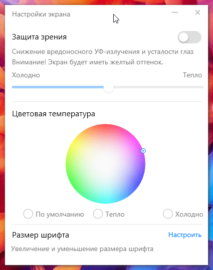 Включение режима Eye Comfort («Защита зрения») снижает интенсивность синей компоненты, насколько именно — можно подправить ползунком (в Windows 10 соответствующая настройка и так есть). Почему такая коррекция может быть полезной, рассказано в отдельной статье. В любом случае, при работе за ноутбуком на ночь глядя лучше снизить яркость экрана до низкого, но еще комфортного уровня. Желтить картинку нет никакого смысла.