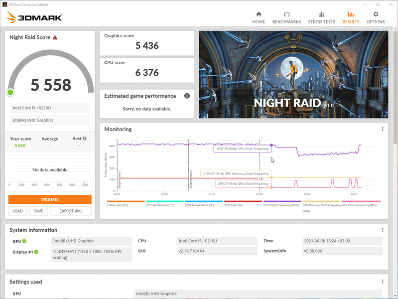 Отличия между этими режимами есть только в начале теста. При питании от электросети ноутбук кратковременно пытается работать на очень высокой частоте процессора, вплоть до 4,2 ГГц. Однако так как он практически моментально перегревается и срабатывает троттлинг, то частота сбрасывается сначала до 3,1-3,3 ГГц, а затем стабилизируется на 2,7 ГГц и больше по ходу стресс-теста не меняется. Тепловыделение при этом составляет 24 ватта, а температура наиболее горячего ядра — 68 °C. При работе ноутбука от аккумулятора такого скачка частот и температур, как в первом случае, мы не наблюдаем. Процессор вообще не разгоняется выше 3 ГГц и 30 ватт, но и максимум температуры — только 78 °C, даже без намеков на троттлинг. А итоговая стабилизация происходит на тех же 2,7 ГГц — правда, при чуть более высокой температуре 72 °C. В обоих режимах ноутбук субъективно работает сравнительно тихо и не вызывает дискомфорта, а в типичном офисе его вообще сложно будет выделить по уровню шума.